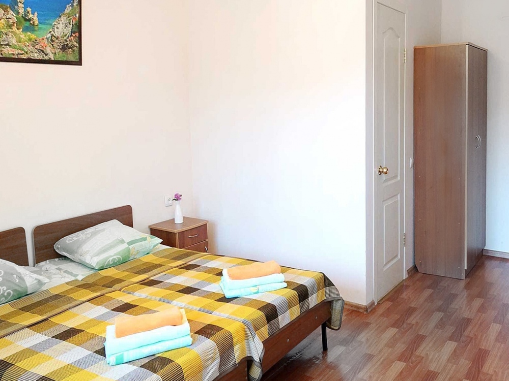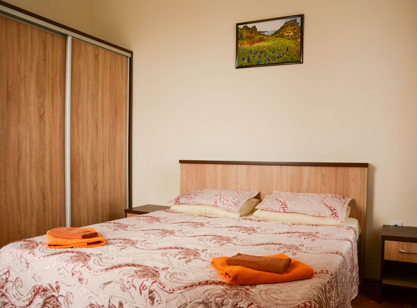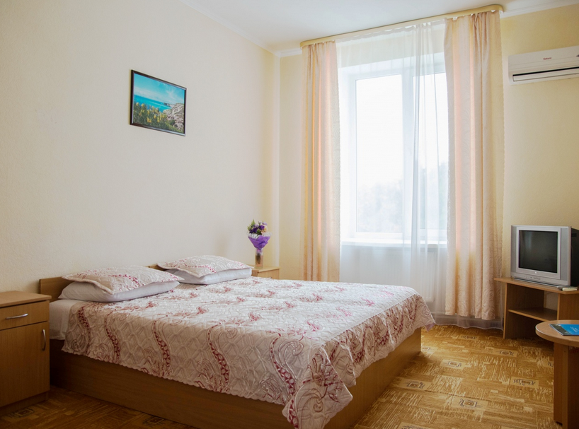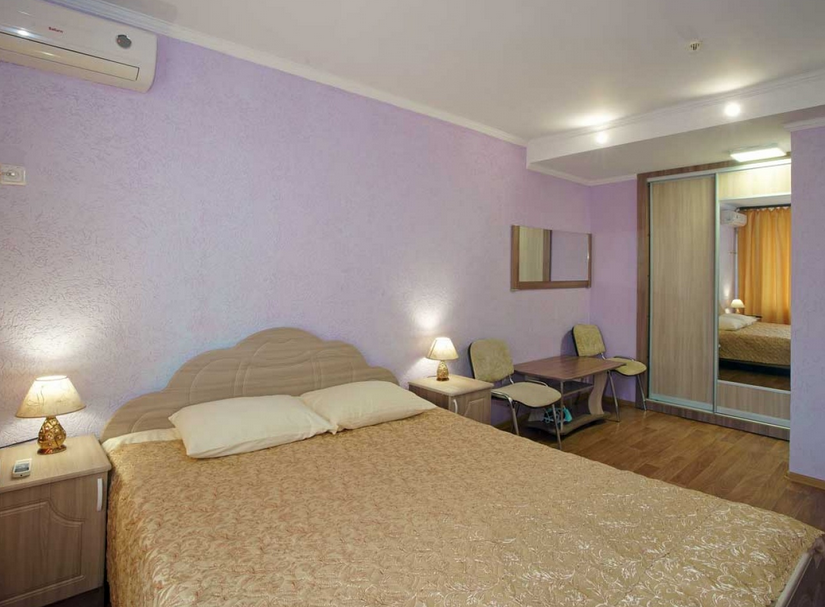 - 2-х местный 1-но комнатный улучшенный. Площадь: 13 м². В номере: двуспальная кровать, кондиционер, телевизор, холодильник, электрический чайник, чайный набор, санузел с душем, балкон.