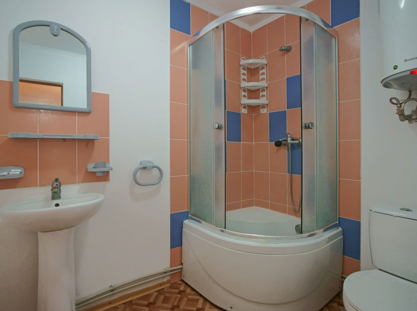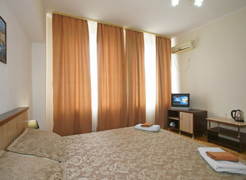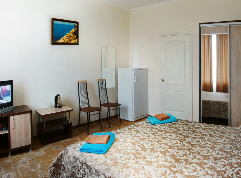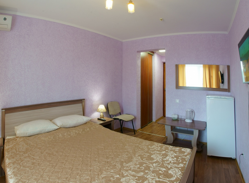 - 2-х местный 1-но комнатный улучшенный. Площадь: 18 м². В номере: двуспальная кровать, кондиционер, телевизор, холодильник, электрический чайник, чайный набор, санузел с душем.