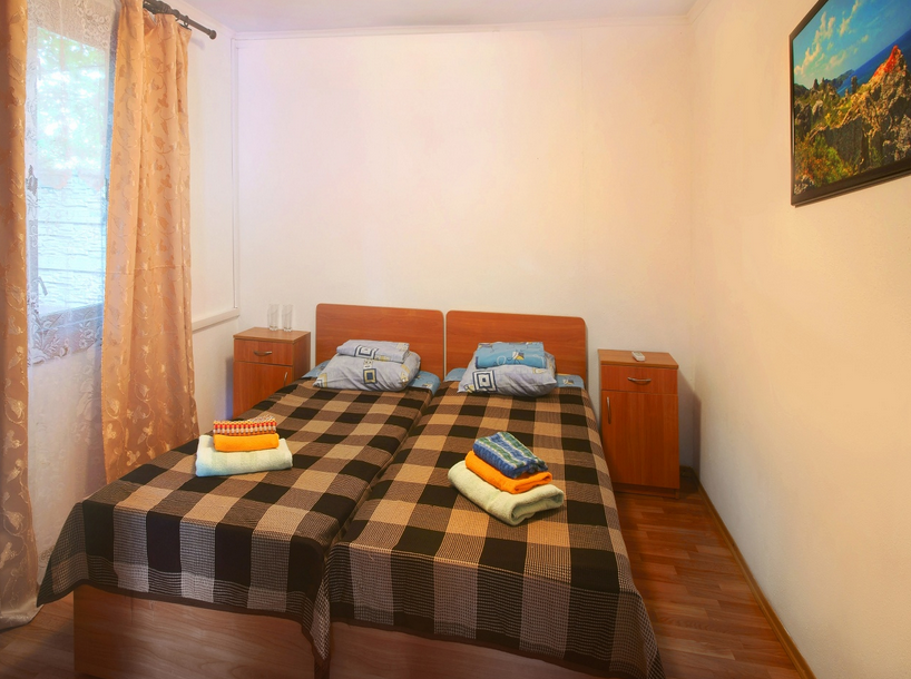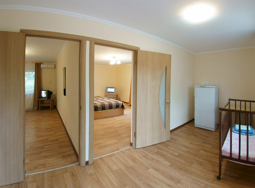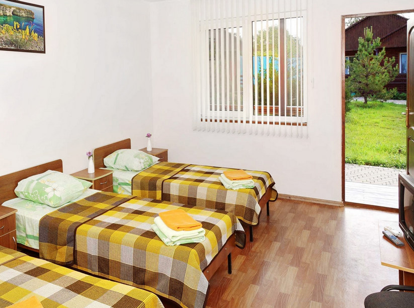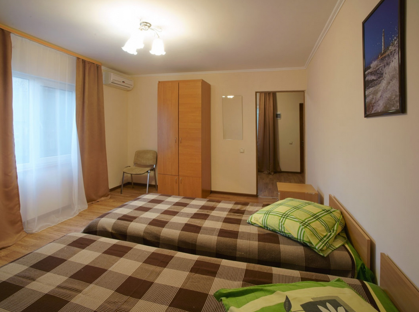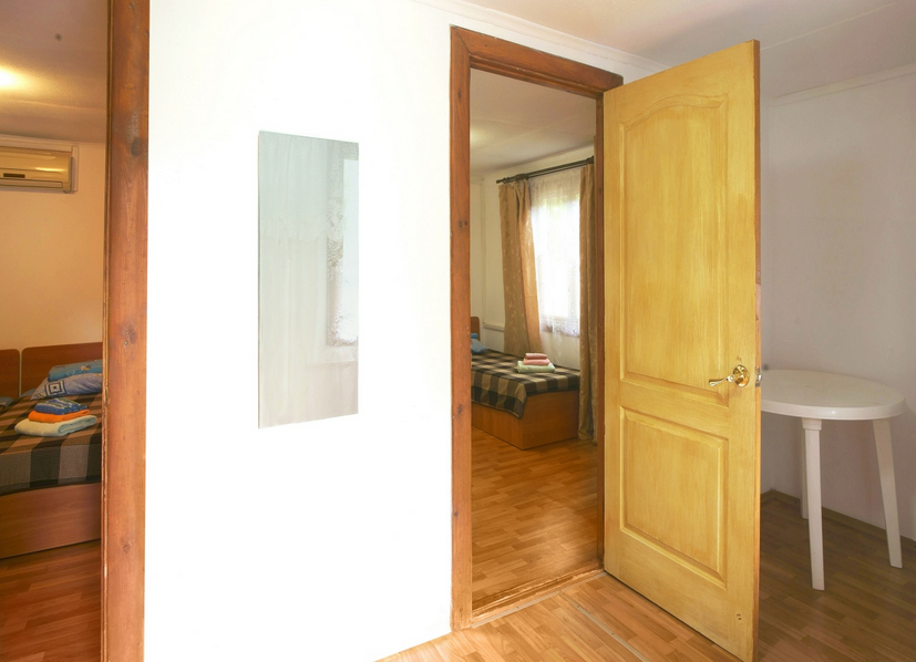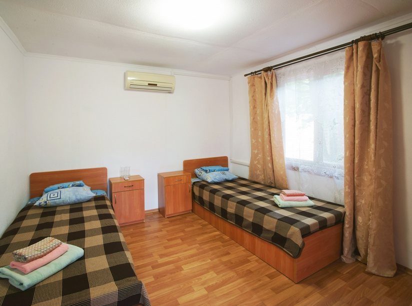 - 4-х местный 2х комнатный коттедж. Площадь: 30 кв.м. В номере: две спальни, в каждой по две односпальные кровати, кондиционер, телевизор, холодильник, санузел с душем, терраса.