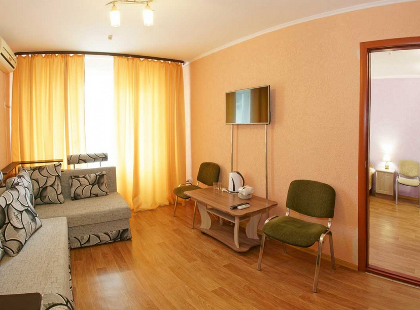 - 4-х местный 2х комнатный полулюкс. Площадь: 26 кв.м. В номере: спальная с двуспальной кроватью, гостиная с диваном, кондиционер, телевизор, холодильник, электрический чайник, чайный набор, санузел с душем, балкон.
