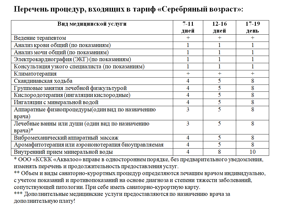 В стоимость входит: проживание в номерах 3-х разовое питание Шведский стол, с предоставлением холодных закусок и напитков, а так же алкогольные напитки в обед и ужин. Лечение: - ведение лечащим врачом; - климатотерапия; - фитотерапия; - физиотерапевтические процедуры - ингаляции; - лечебные ванны; - лечебные души; - ручной массаж (1,5 усл. ед) или механомассаж. - грязелечение; - аромафитотерапия; АКВАКОМПЛЕКС и БАССЕЙНЫ Бассейны с морской водой, термальные бассейны, экстремальные горки, лежаки, анимация ПЛЯЖНЫЙ КОМПЛЕКС Закрытый оборудованный пляж: зонты, шезлонги, закрытый аэрарий, комфортные лежаки ДЕТСКИЙ ОТДЫХ Детская игровая комната «ЛООШКА» СПОРТ и РАЗВЛЕЧЕНИЯ Открытые спортплощадки, Тренажерный зал, Услуги спорткомплекса (инвентарь), Ночной клуб-бар «Затерянный Рай» с 22.00 до 04.00 СЕРВИС Услуги службы сервиса и качества, Доступ к сети Wi-Fi по всей территории, Услуги навигации по территории карта-схема.