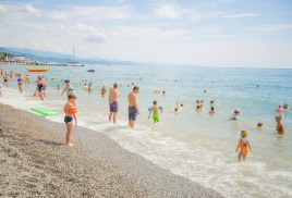 На территории пляжа спасательный пост, торговые точки, где можно приобрести напитки и мороженое. Расстояние от пляжа до санатория - 500 м.