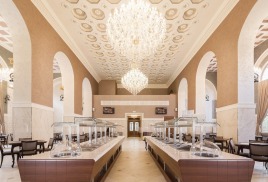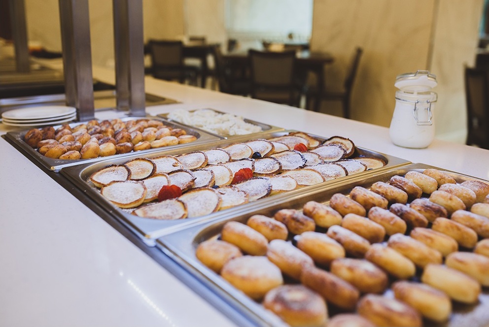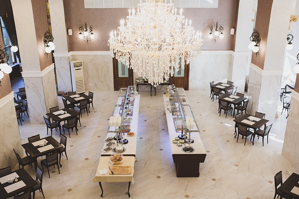 Зал “Шведского стола” отеля представляет собой просторный светлый зал с огромными арочными окнами и изысканным антуражем — классическая лепнина, огромные люстры в венецианском стиле подчеркивают великолепный архитектурный ампир. Благородство и шарм – эти слова характеризуют зал. Наш Шеф-повар предлагает гостям широкий выбор блюд шведской линии с многообразием местных сезонных фруктов и овощей. В работе наши повара используют продукты только высочайшего качества.