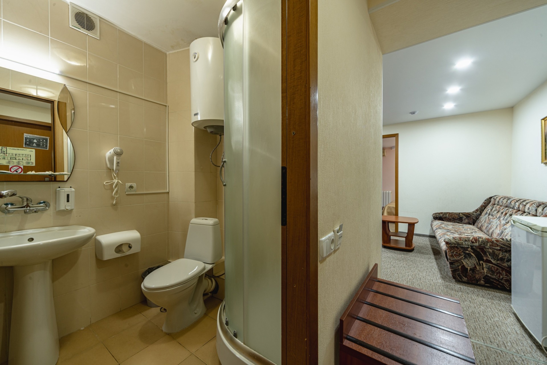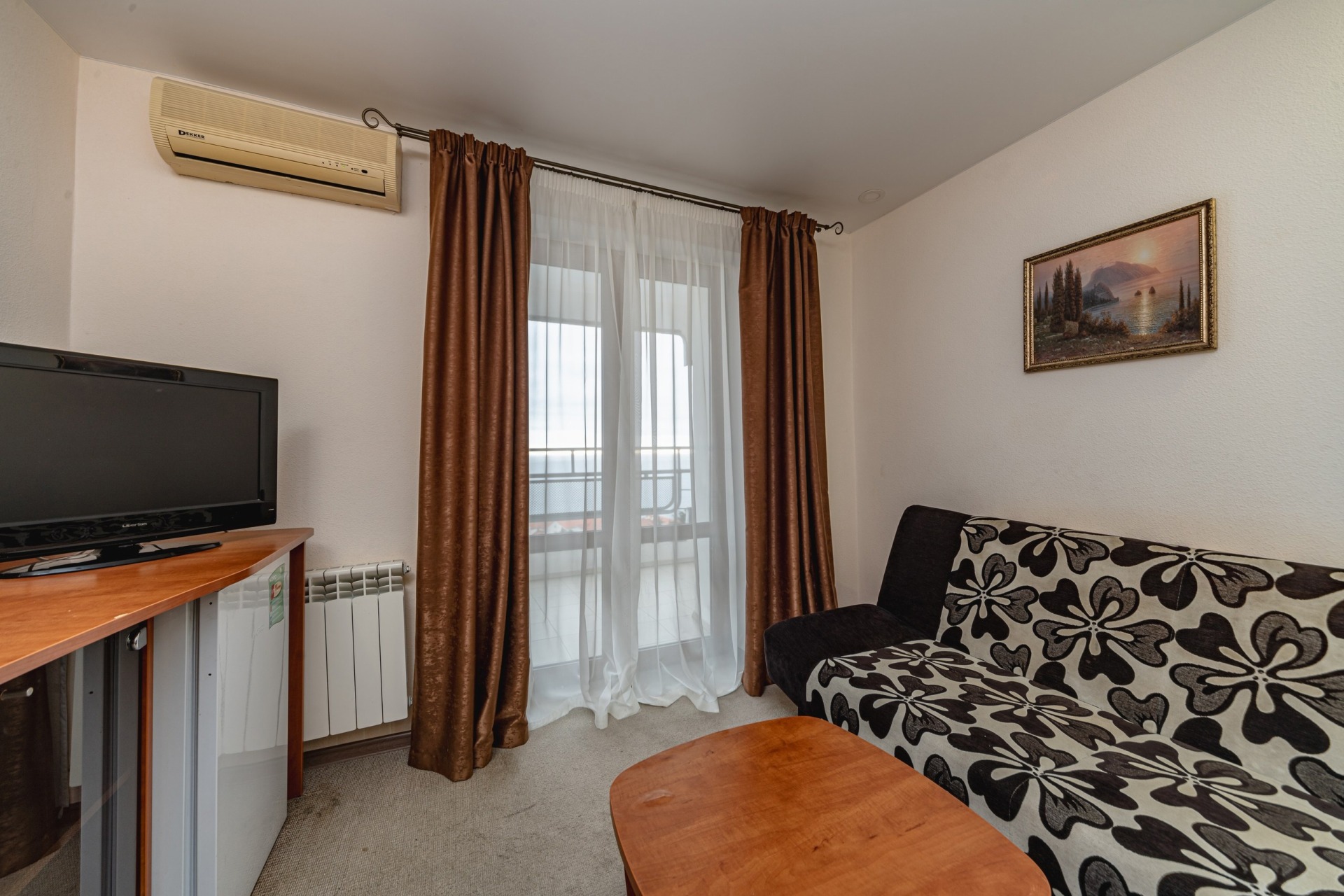 - 2-местный 2-комнатный Повышенной комфортности Север / Юг. В номере: гостиная с мягкой мебелью, спальня с двуспальной кроватью, санузел с душем, телевизор, холодильник, бойлер, кондиционер, балкон.