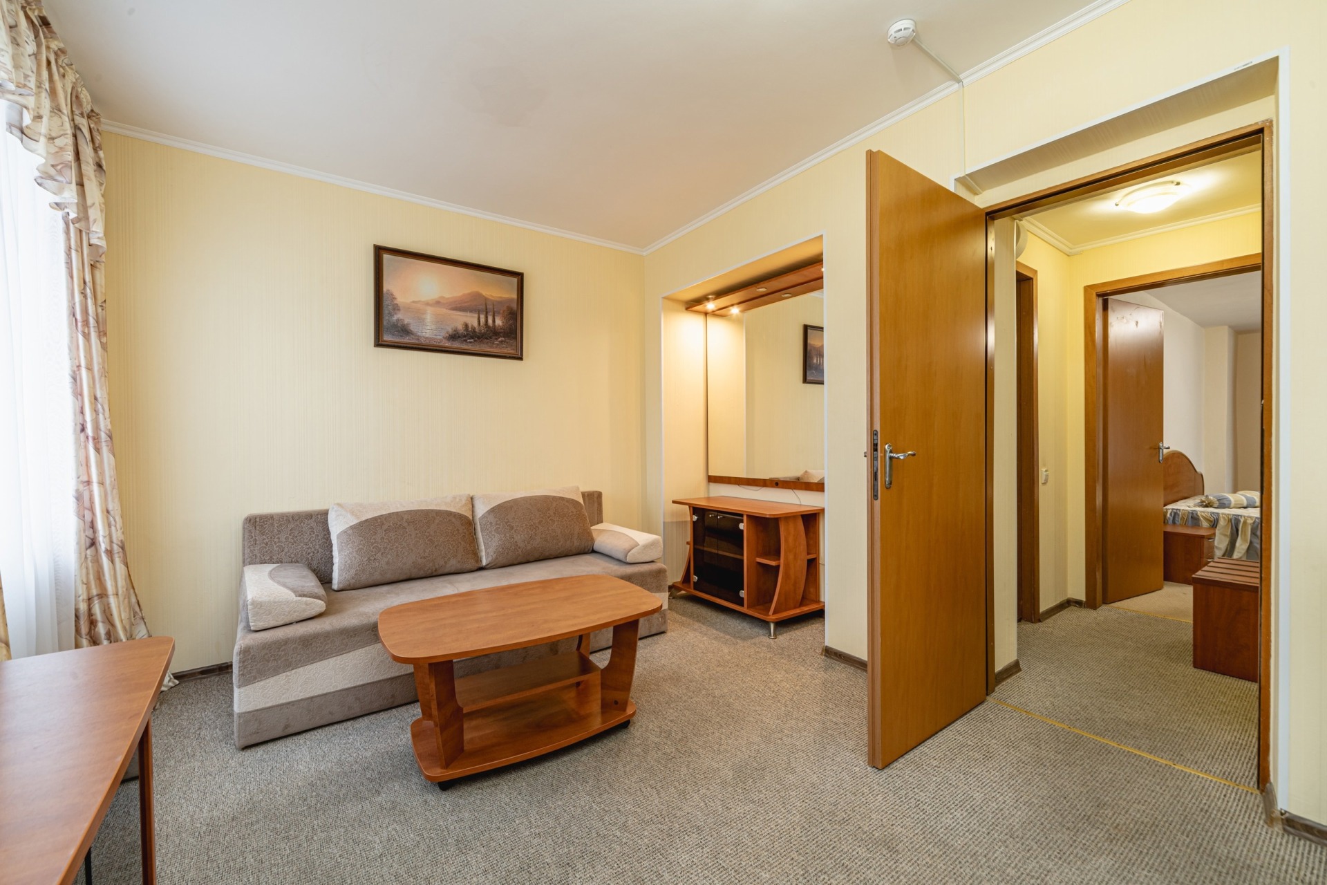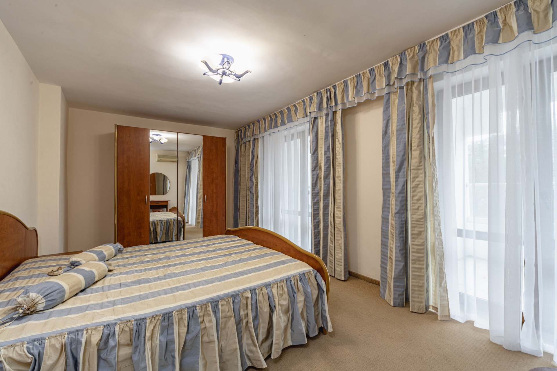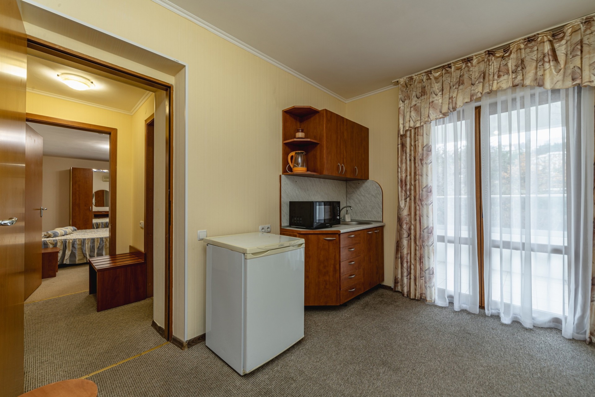 - 2-местный 3-комнатный Полулюкс. В номере: две спальни с двуспальными кроватями, гостиная с мягкой мебелью, санузел с душем, телевизор, холодильник, бойлер, кондиционер, мини-кухня, набор посуды, микроволновая печь, электрочайник, балкон (вид на север).