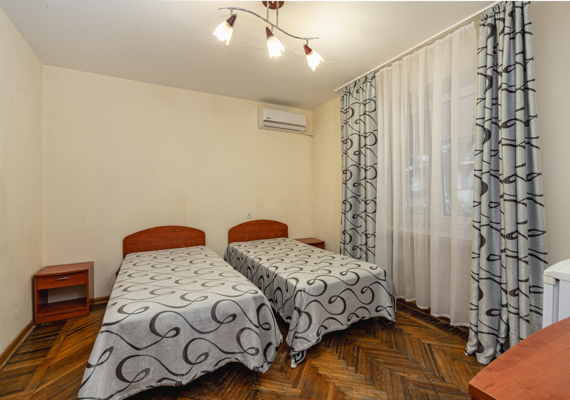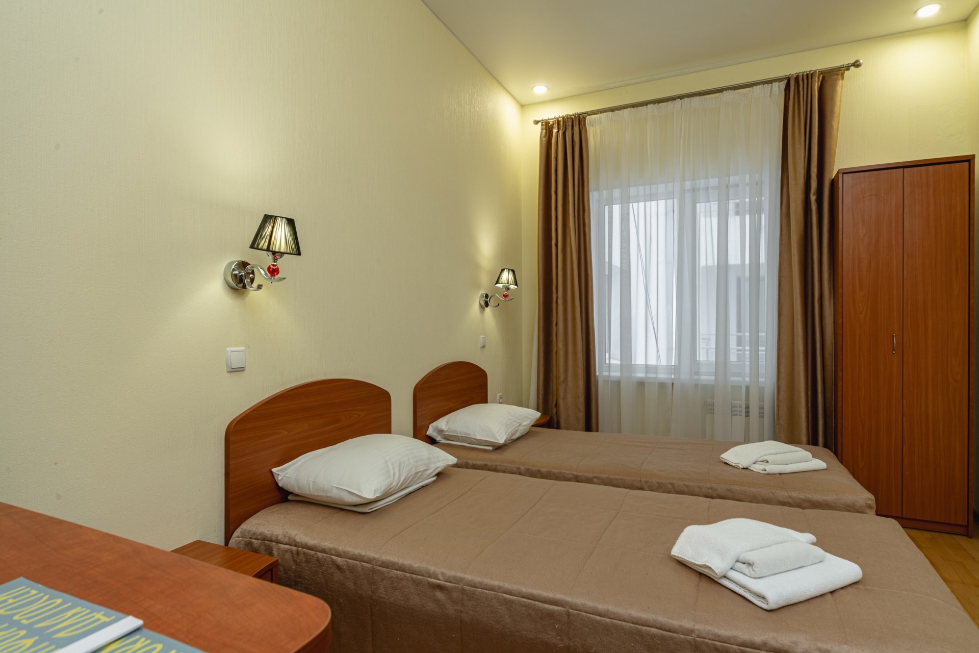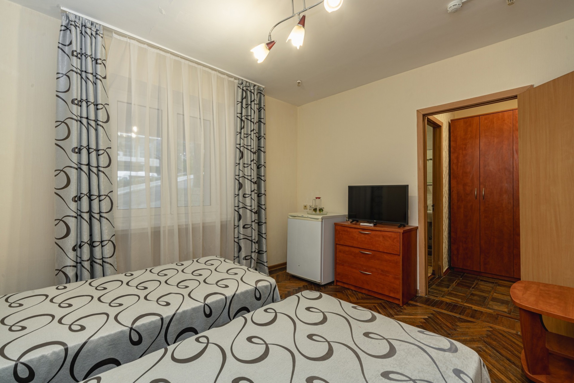 - 2-, 3-местный 1-комнатный Эконом без балкона. В номере: 2 или 3 односпальные кровати, телевизор и холодильник. Санузел (душ, туалет,умывальник) на блок из 2-х номеров 2+3.