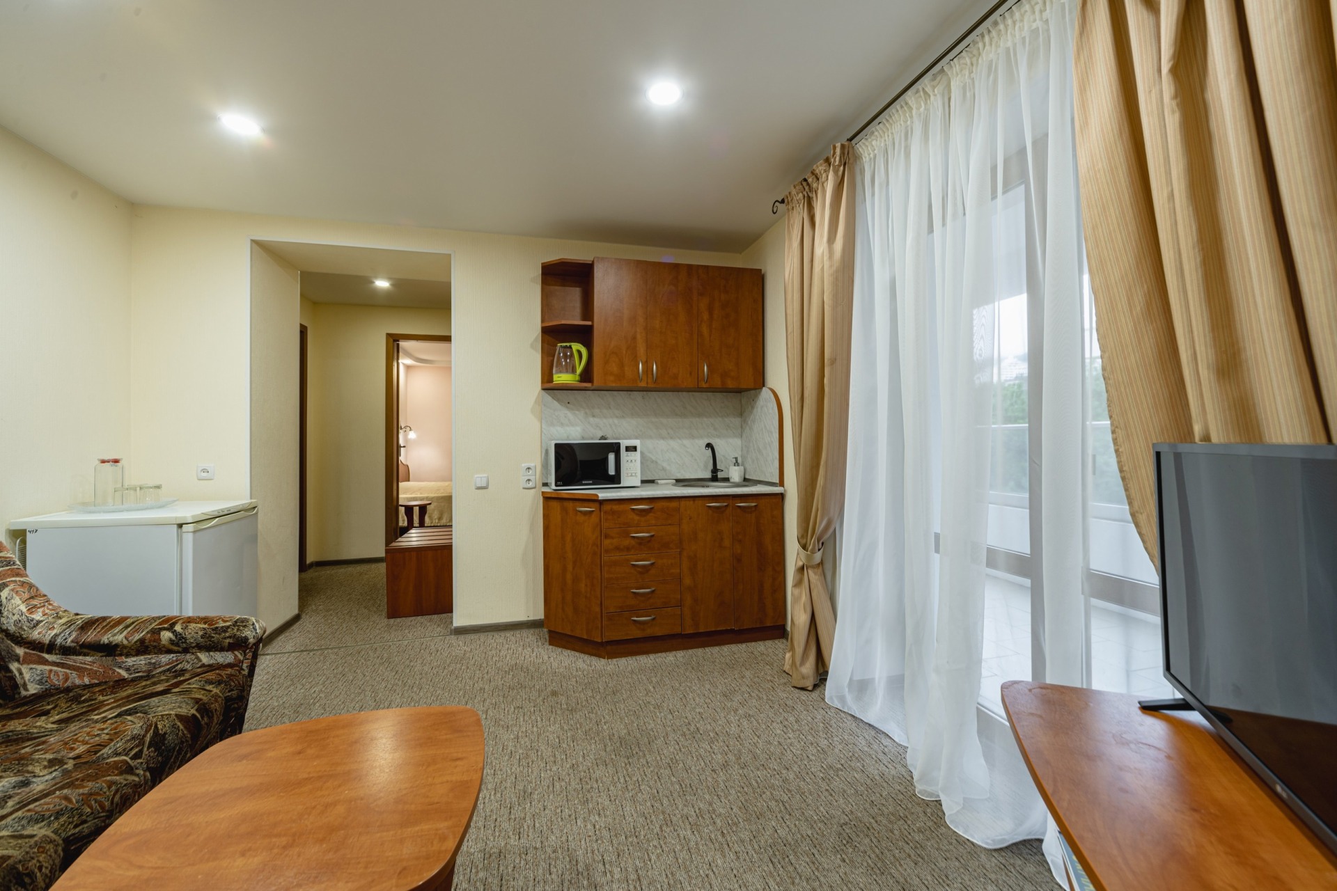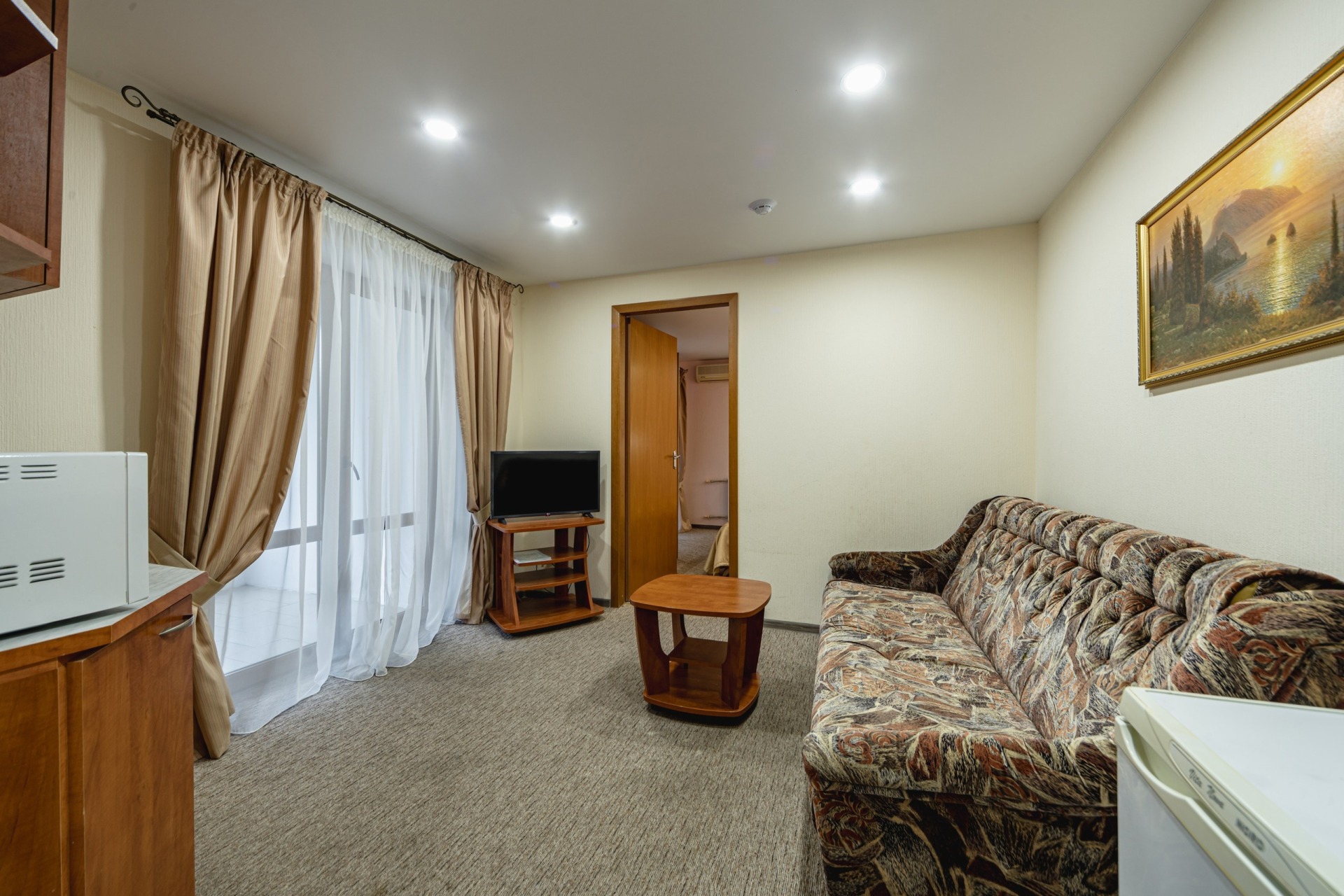- 2-местный 2-комнатный Повышенной комфортности Семейный. В номере: гостиная с мягкой мебелью, спальня с двуспальной кроватью, санузел с душем, телевизор, холодильник, бойлер, кондиционер, мини-кухня, набор посуды, микроволновая печь, электрочайник, балкон.