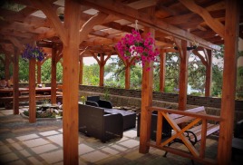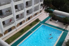 Открытый бассейн 8х15 м с пресной водой без подогрева, оборудованный зоной гидромассажа, рядом с бассейном организована зона отдыха с лежаками. Работает сезонно.