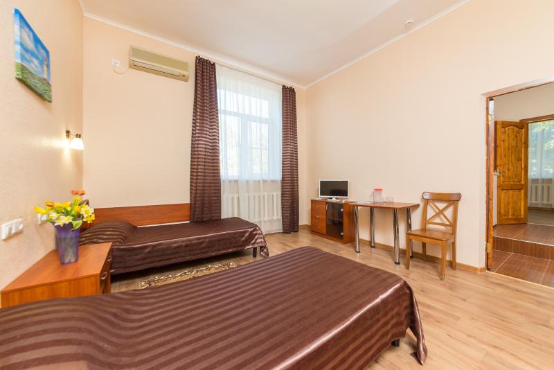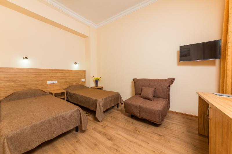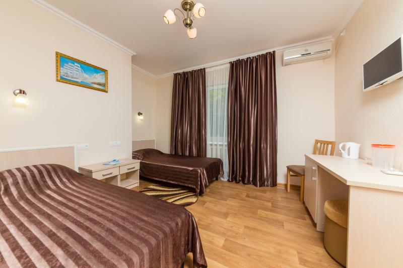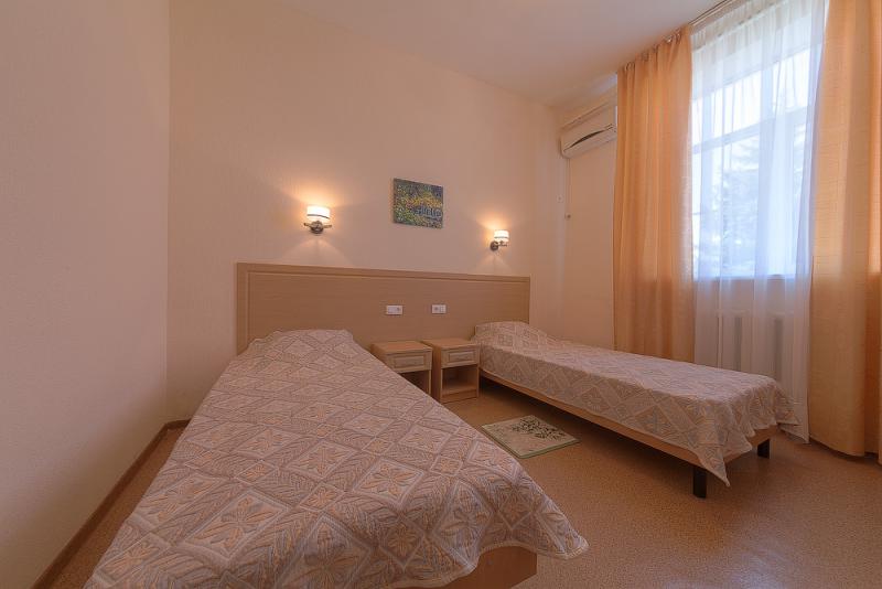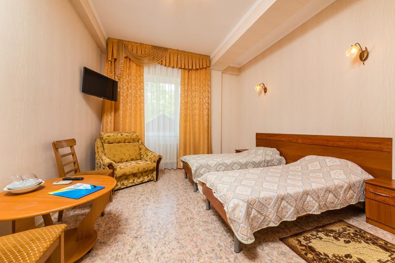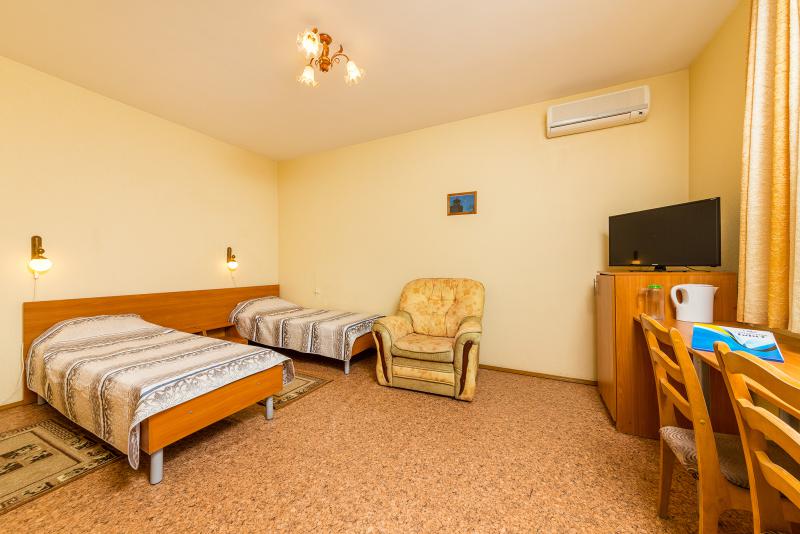 Номер состоит из одной комнаты, совмещенного санузла и прихожей. В номере: две односпальные кровати, две тумбочки, два стула, стол, шкаф для одежды; ЖК-телевизор, холодильник,чайник, сплит-система, сушилка для белья, фен.