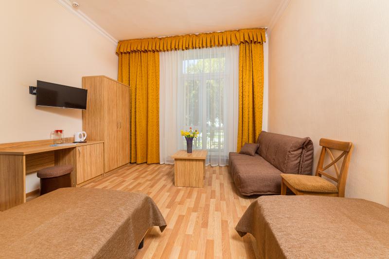 - 3-местные 1 категории (с балконом). В номере: три односпальные кровати, кресло, три тумбочки, три стула , стол; в прихожей: шкаф для одежды, вешалка с полкой для обуви и чемодана, зеркало; телевизор, холодильник, сплит-система.