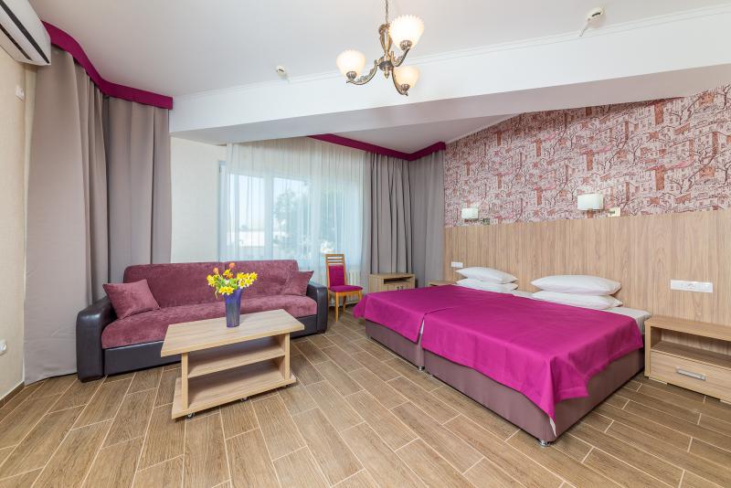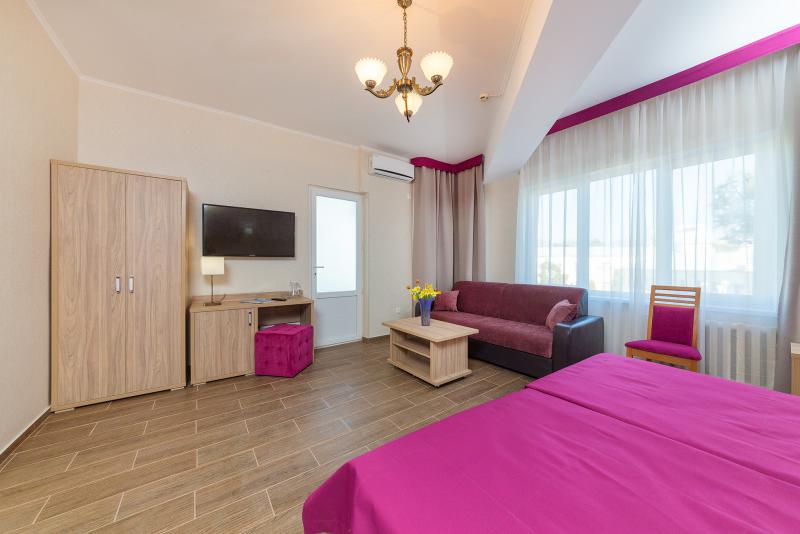 - 2-местный номер "Джуниор Сюит". Площадью – 18-29 кв.м., с балконом, состоят из одной комнаты, совмещенного санузла и прихожей. В номере: две кровати, диван, две тумбочки, два стула, шкаф для одежды, стол, зеркало; в прихожей: вешалка, полка для обуви и чемодана; ЖК-телевизор, холодильник, сплит-система, чайник, сушилка для белья.