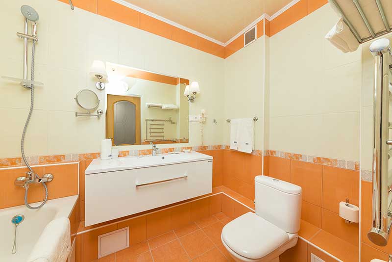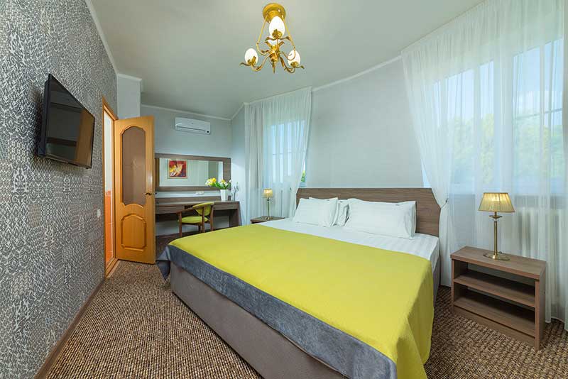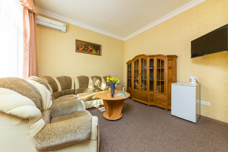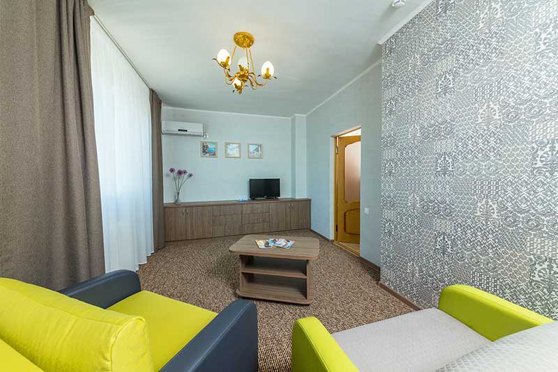 - 2-местные 2-комнатные 1 категории. Номера состоят из двух (проходных) комнат: гостиной, спальни и санузла. В спальне — двухспальная кровать, туалетный столик с зеркалом, две тумбочки, два кресла, шкаф-купе. В гостиной- диван, кресло, журнальный столик, горка с посудой, стулья, вешалка с полкой для обуви и чемодана. В номере телевизор, холодильник, сплит-система, чайник.