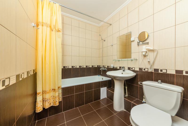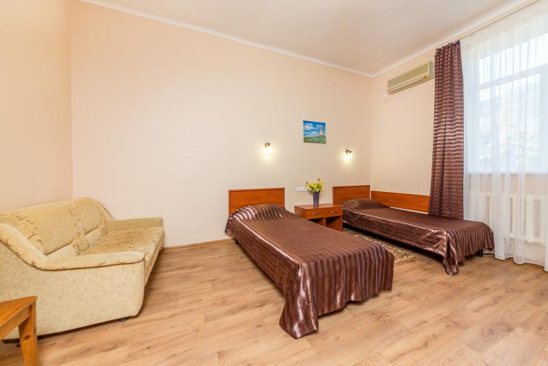 - 2-местный номера 1 категории "Комфорт". Номера с дополнительными местами (кресло-кровать или диван-кровать), без балконов. Номера однокомнатные и двухкомнатные, площадью от 15 кв.м. Номер состоит из одной или двух комнат (комната с двумя кроватями + комната с диваном), совмещенного санузла и прихожей. В номере: две кровати, две тумбочки, два стула , журнальный столик, шкаф для одежды; сплит-система, ЖК-телевизор, холодильник, чайник, фен, сейф.