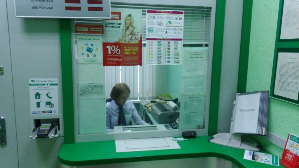 Возможно снятие денежных средств (снятие наличных денег с российских банковских карт в белорусских рублях с комиссией), обмен валют в отделении Белинвестбанка. Проводятся операции со следующими банковскими картами:VISA, VISA ELECTRON, MASTER CARD, MAESTRO.