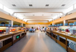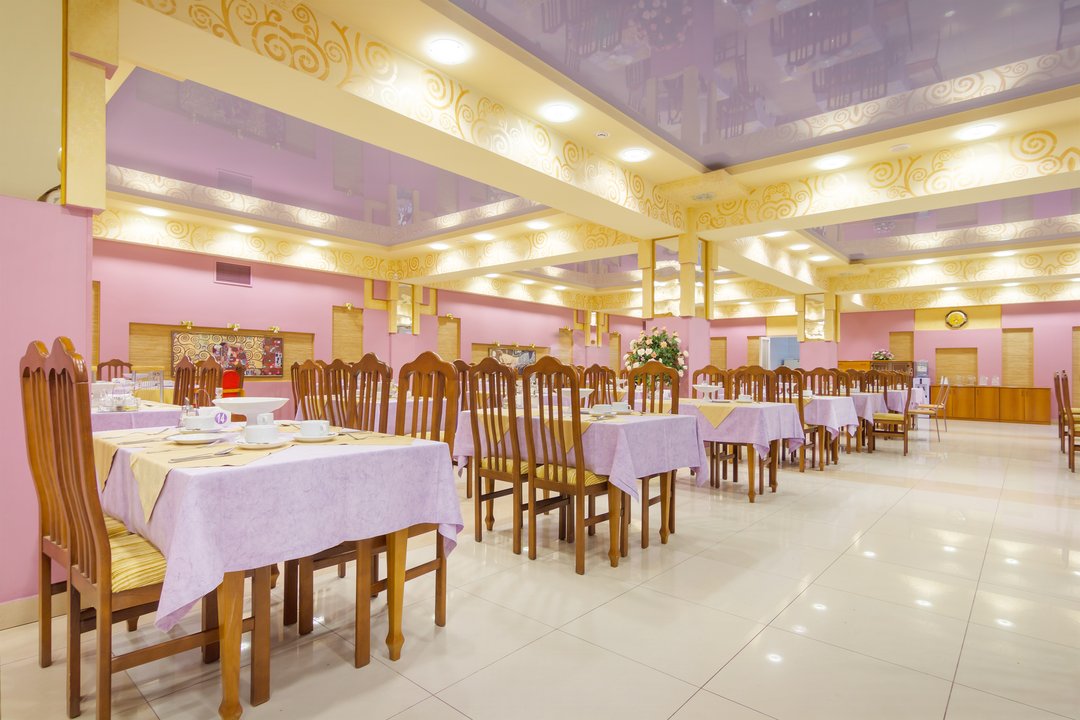 Для наших гостей организовано питание по системе “Шведский стол”. Вас ждут разнообразные горячие блюда, салаты, сезонные овощи и фрукты, выпечка и напитки. Ресторан располагается в этом же корпусе. Также этим залом питения пользуются проживающие корпуса "Нептун". При необходимости диетсестра поможет спланировать сбалансированное питание на время Вашего отдыха и лечения.