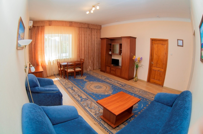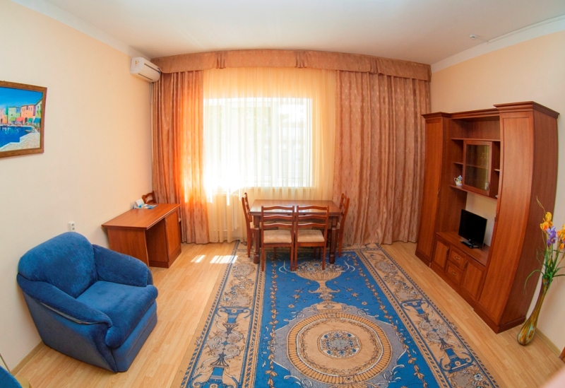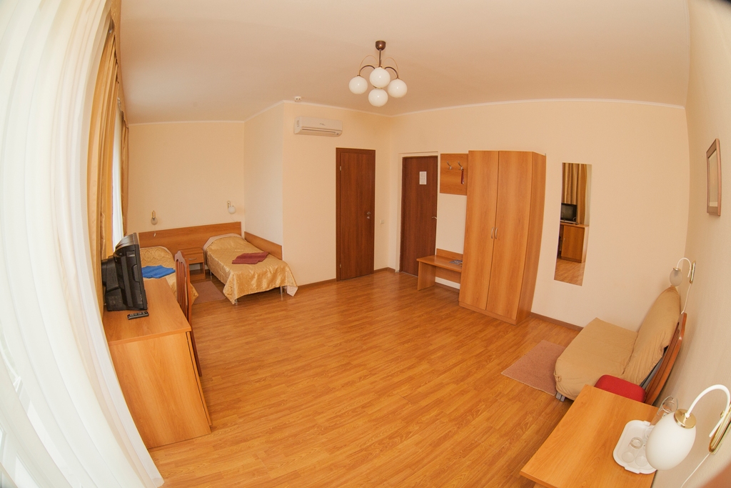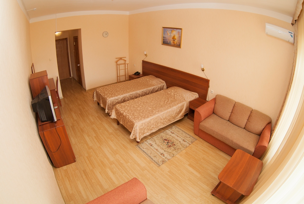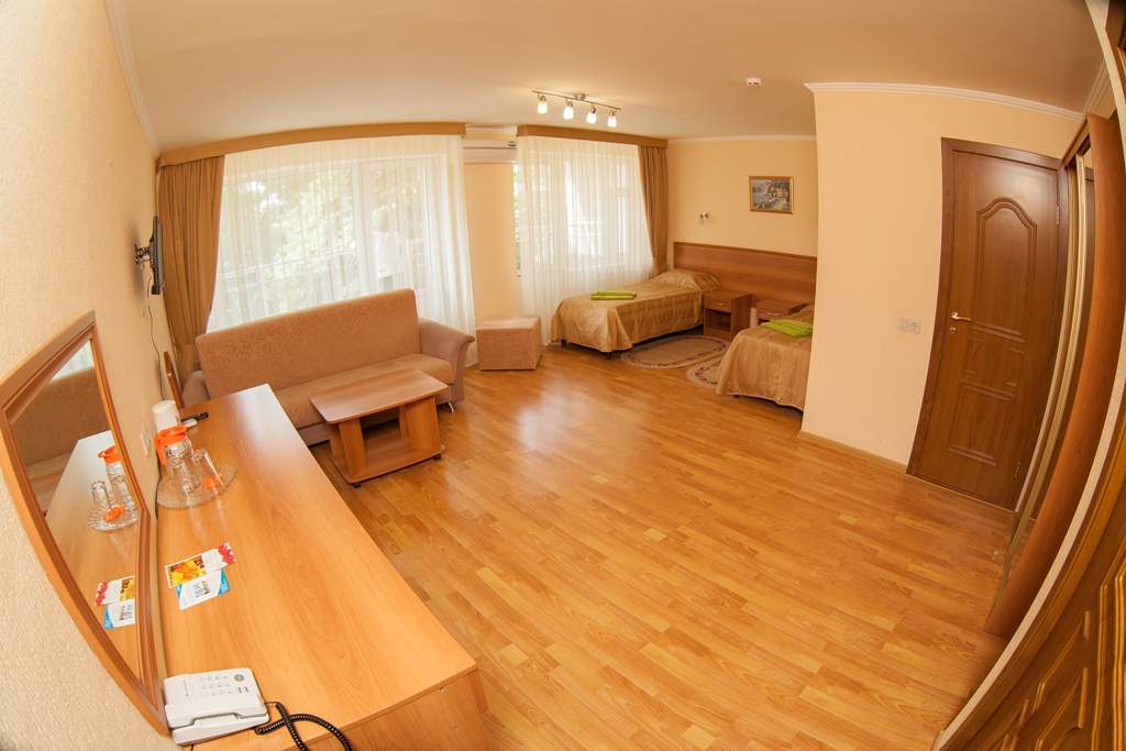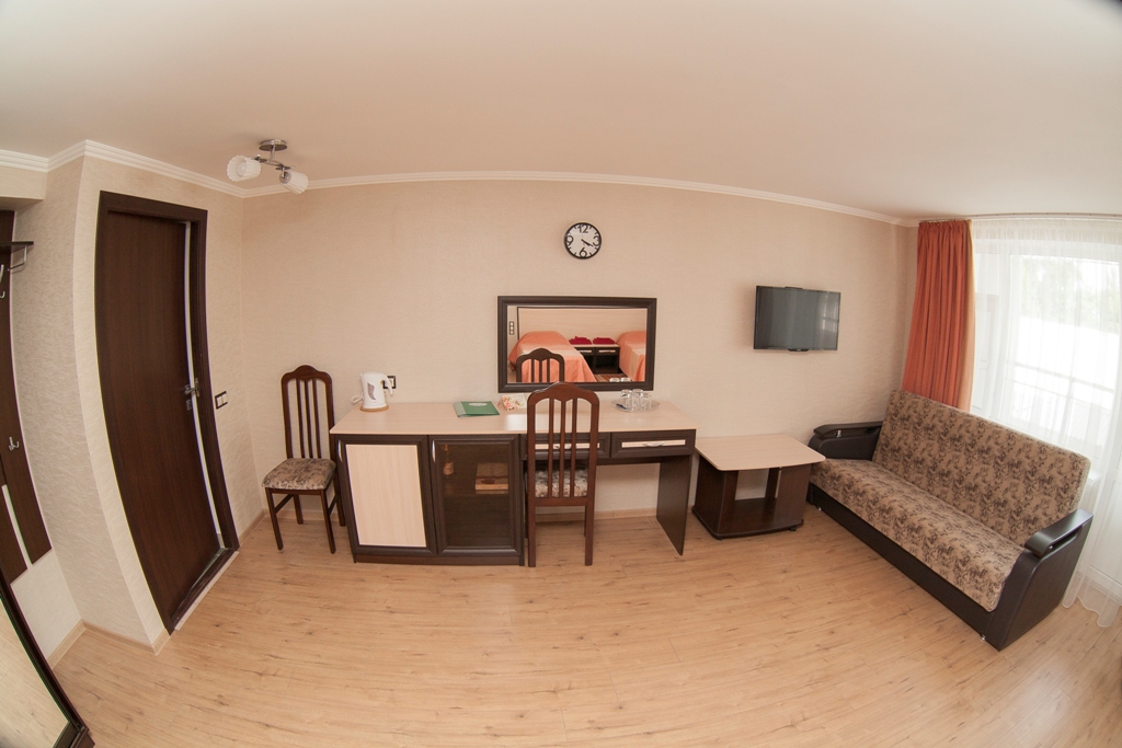 - 1-комнатный 2-местный номер Корпус №1/2/6 - 1 доп. место: две одноместные кровати, две прикроватные тумбочки, шкаф/платяной шкаф, диван, журнальный столик, стулья, половое покрытие- ламинат, сплит- система, телефон, потолочное освещение, два прикроватных светильника, ЖК телевизор, мини-холодильник, графин, стаканы.В ванной комнате: душ, санузел, зеркало, туалетные принадлежности, фен, полотенцесушитель.
