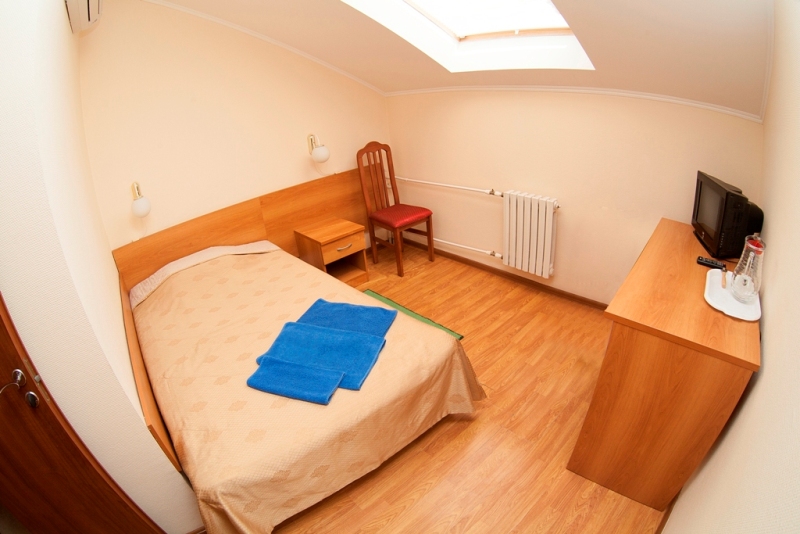 - 1-комнатный 1-местный номер (стандарт) Корпус №3 - без доп. мест, 4 этаж, мансардное окно (в крыше), без балкона.В номере: одна одноместная кровать, прикроватная тумбочка, шкаф/платяной шкаф, стул, стол/туалетный стол, сплит-система, потолочное освещение, прикроватный светильник, телевизор, мини-холодильник.В ванной комнате: ванная/душевая кабина, санузел, зеркало, туалетные принадлежности.