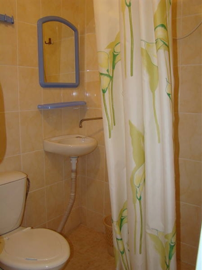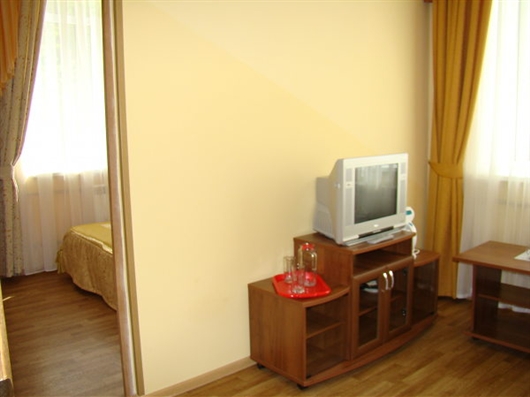 - 2-х местный номер "ЛЮКС": 2 комнаты - спальня и гостиная. В спальне 2-спальная кровать, тумба, шкаф, гладильная доска, утюг. В гостиной - диван, телевизор, холодильник. тумба, журнальный стол, чайник. Санузел совмещённый: душевая кабина и унитаз. Без балкона.