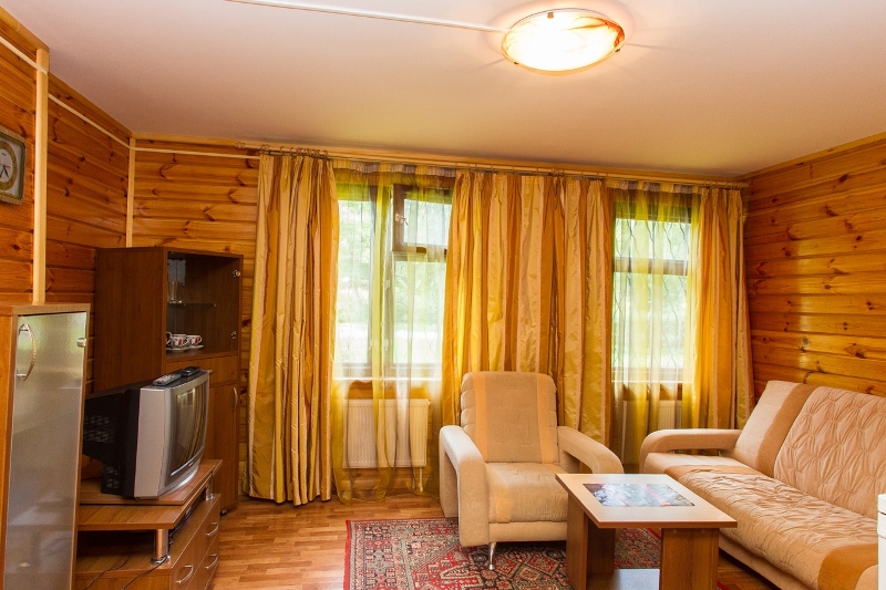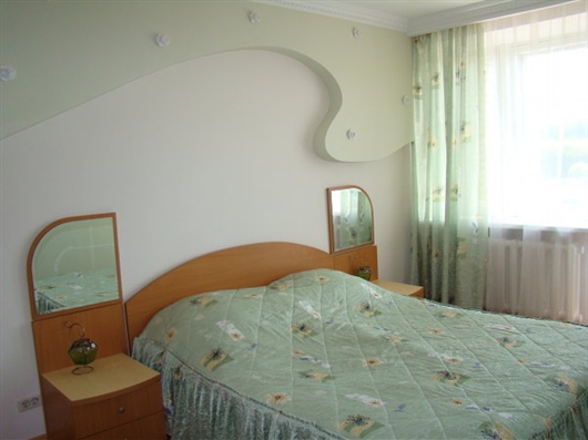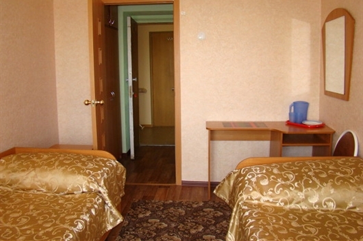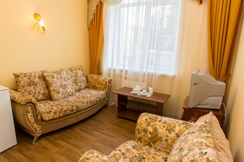 - 2-х местный номер "ЛЮКС": 2 комнаты - спальня и гостиная. В спальне 2-спальная кровать, тумба, шкаф, гладильная доска, утюг. В гостиной - диван, телевизор, холодильник. тумба, журнальный стол, чайник. Санузел совмещённый: ванна и унитаз. Без балкона.