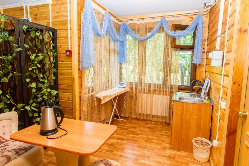 - 2-х местный 2-комнатный номер "ДЕЛЮКС": 2 комнаты - спальня и гостиная. В спальне 2-спальная кровать, тумба, шкаф, гладильная доска, утюг. В гостиной - диван, телевизор, холодильник. тумба, журнальный стол, чайник. Санузел совмещённый: ванна и унитаз. Балкон.