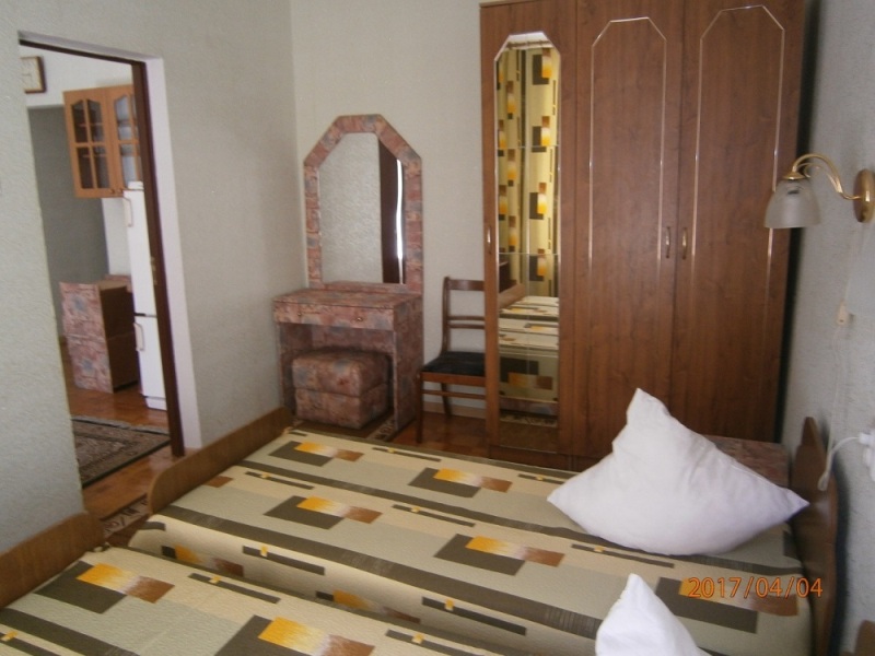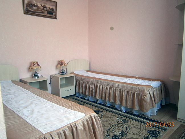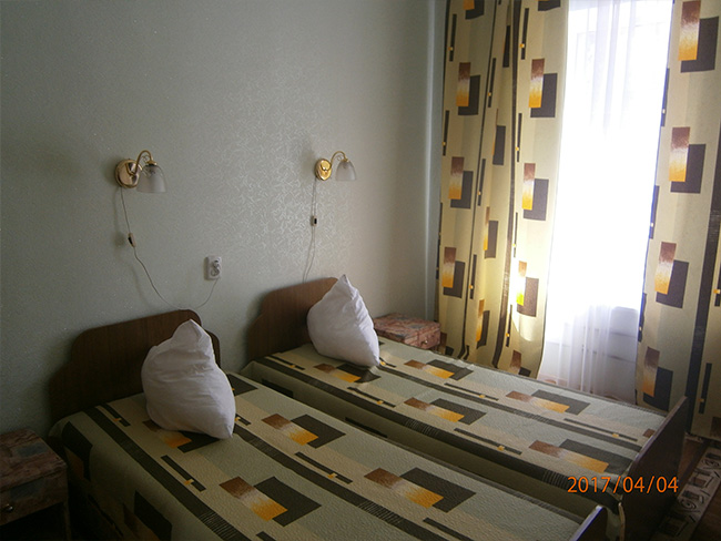 - 2-местный 1-комнатный. В номере: две кровати, кресло, тумбочки, шкаф и стол; холодильник, Wi-Fi, и телевизор, который находится в холле; душ, умывальник и туалет. Общая площадь номера – 14 м. кв.
