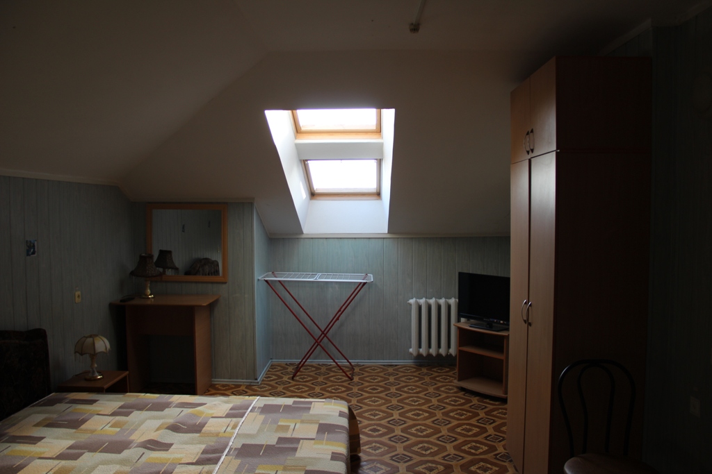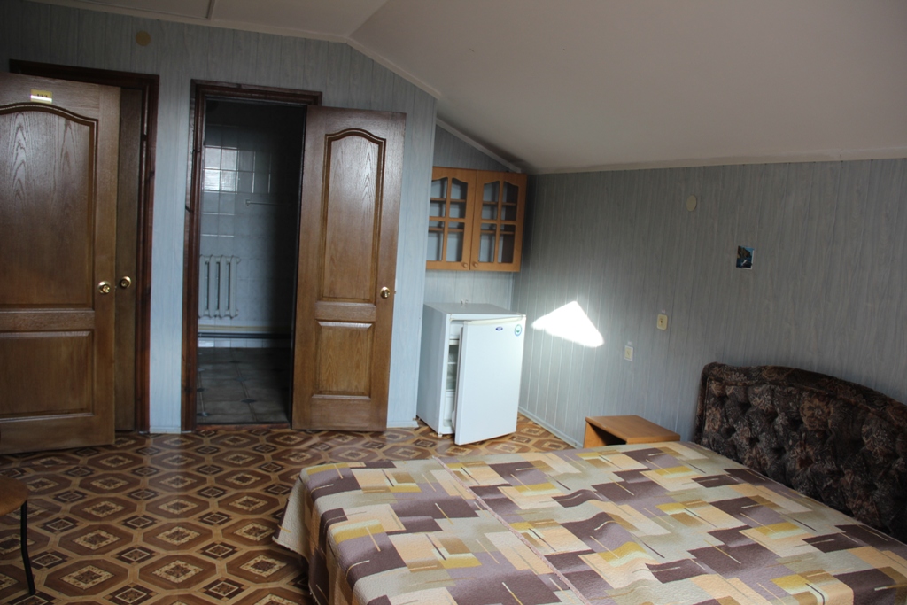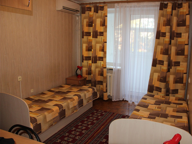 - 2,3-местный 1-комнатный с удобствами на этаже. В номере: две или три кровати, кресло, тумбочки, шкаф и стол; Wi-Fi; телевизор и холодильник (в холле); умывальник; душ и туалет (на этаже). Общая площадь – 18 м. кв;
