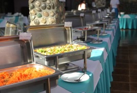 Пансионат «Голубой залив» предлагает питание в соответствии в собственной стационарной столовой на 510 мест. Питание производится по системе "Шведский стол" и включает в себя разнообразные блюда украинской, русской и др. кухонь. Ежедневно выпечка собственного производства.