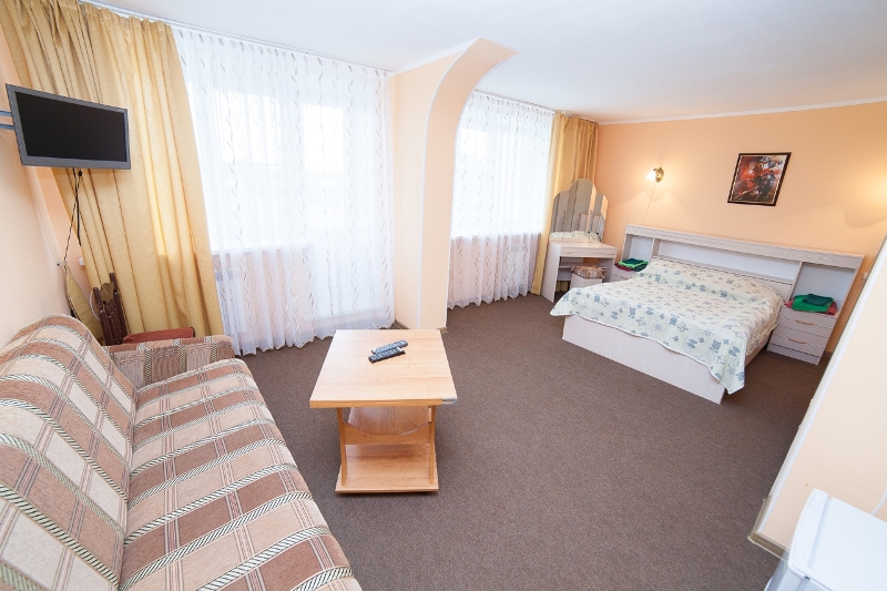 - 1но-комнатный номер Люкс (2 шт., корп.№10, 1 этаж) - номер увеличенной площади. Номер-студия. В номере комплект мягкой мебели, ТВ, холодильник, двуспальная кровать, 2 тумбы. Сан.узел совмещенный (душевая кабина,туалет).