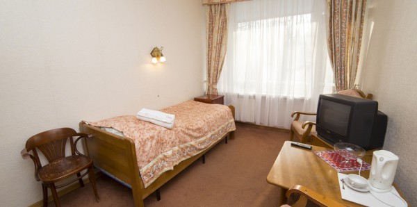1-местные 1-комнатные номера - односпальная кровать, ТВ, холодильник, умывальник в номере, (с/у, душ на этаже). Есть номера с балконами (вид на лес) и без балконов (вид на вход в корпус). Возможно установить 1 доп. место (раскладушка).