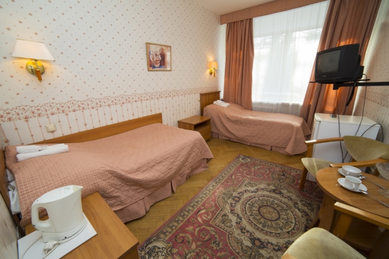 2-местные 1-комнатные номера - 2 раздельные кровати, ТВ, холодильник, умывальник в номере, (с/у , душ на этаже). Есть номера с балконами (вид на лес) и без балконов (вид на вход в корпус). Возможно установить 1 доп. место (раскладушка).