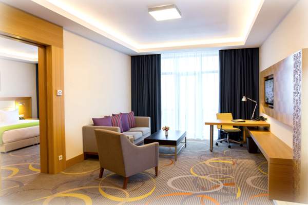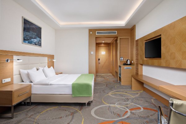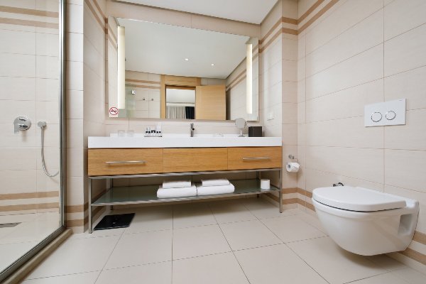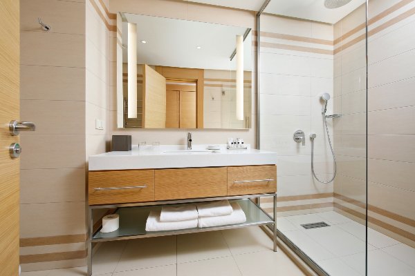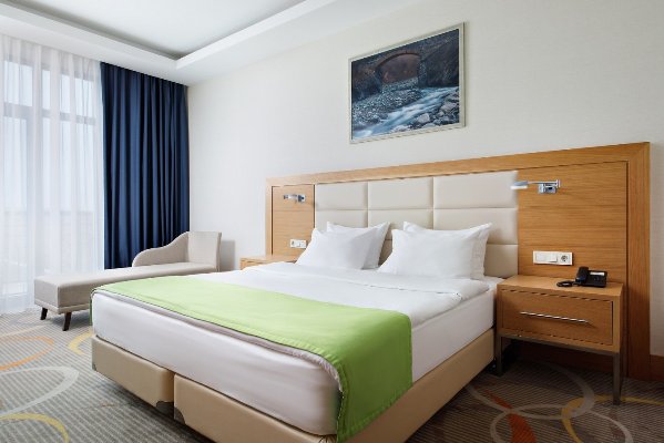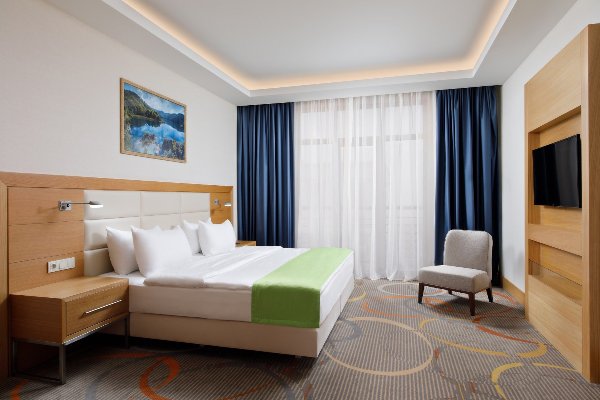 Два 10-этажных корпуса с лифтами соединены в общий комплекс со столовой, бассейном и лечебным отделением.