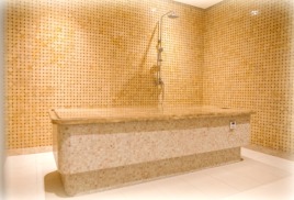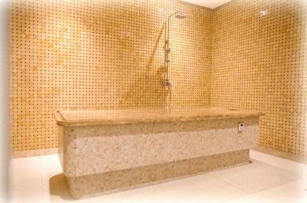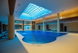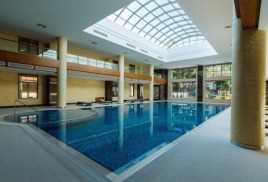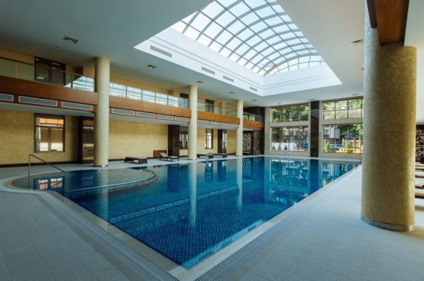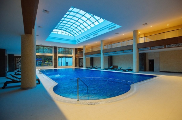 Бассейн санатория - это 250 кв.м. кристальной воды с обустроенной акватермальной территорией. Длина бассейна- 22 м., ширина - 10 м. Для ценителей релакса бассейн оснащен зоной джакузи. Водопад Каскад предусмотрен для тех, кто хочет совместить пользу от водных процедур и эффект массажа. Декоративную и оздоровительную функцию несет в себе водный аттракцион «Гейзер». На акватермальной территории гости могут воспользоваться сауной и хамамом.