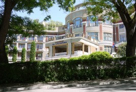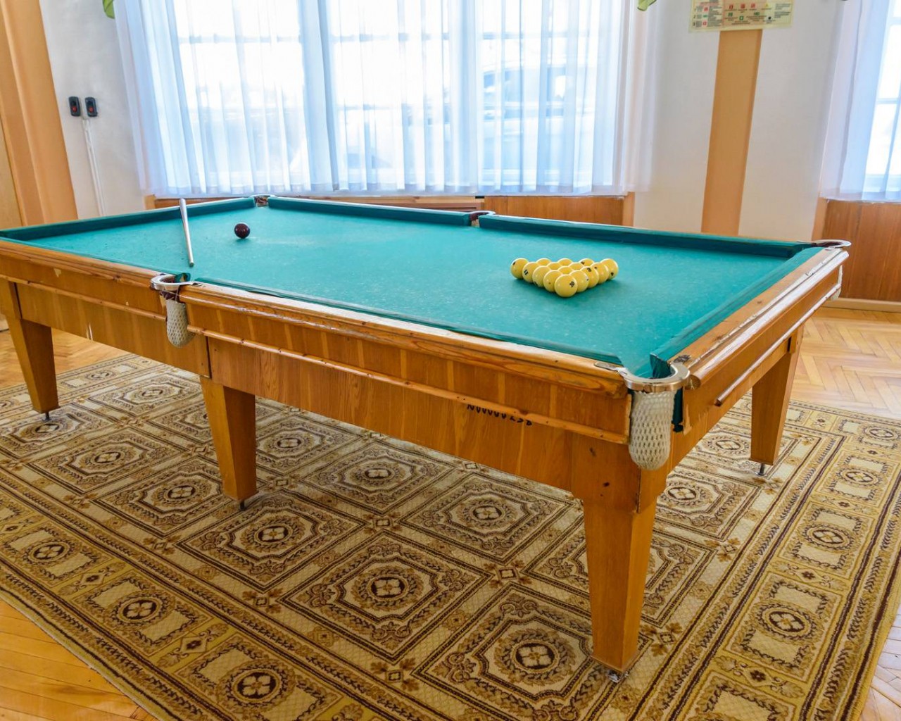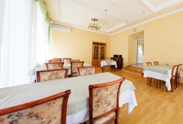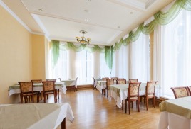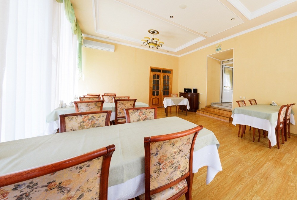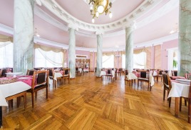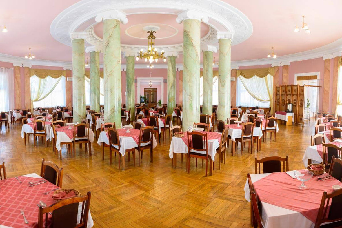 Для удобства отдыхающих работают 2 пищеблока и 2 обеденных зала. Столовая главного корпуса — великолепный круглый зал с мраморными колоннами, рассчитана на 140 посадочных мест.