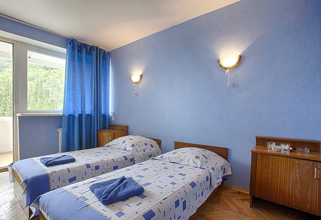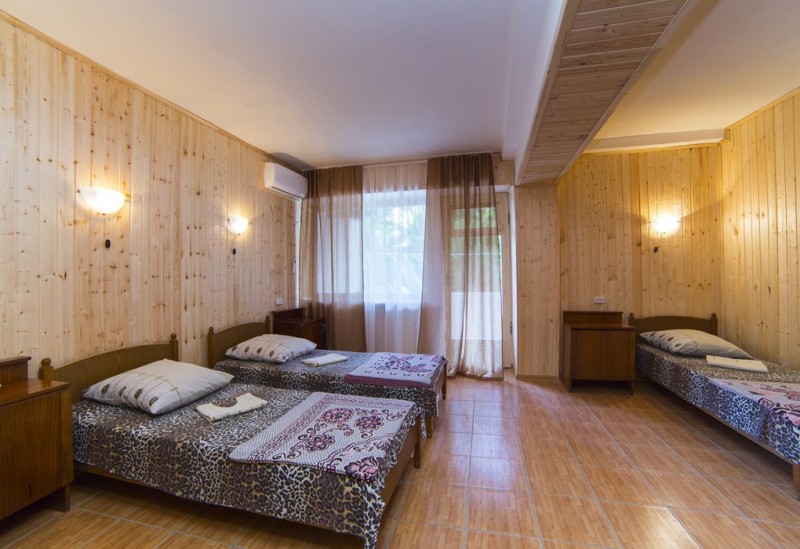 В номере: три односпальные кровати / одна двуспальная кровать + односпальная кровать, прикроватные тумбочки, стулья, стол, кондиционер, зеркало, холодильник, телевизор, балкон. Санузел: умывальник, зеркало, унитаз, душ или ванна, полотенца.