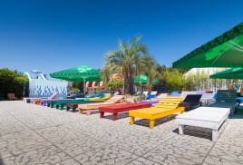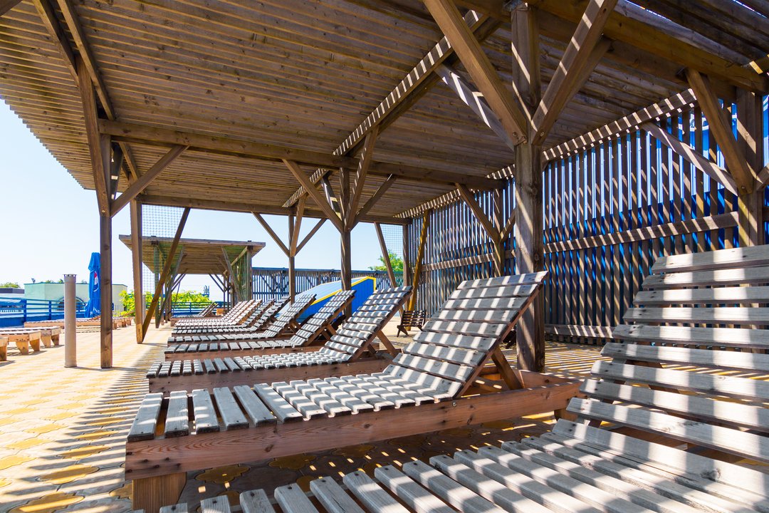 Для комфортного отдыха на территории бассейна расположены душевые, санузел, медпункт, кафе, деревянные лежаки и теневые навесы.