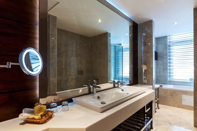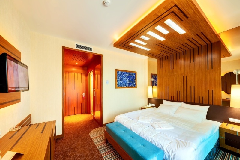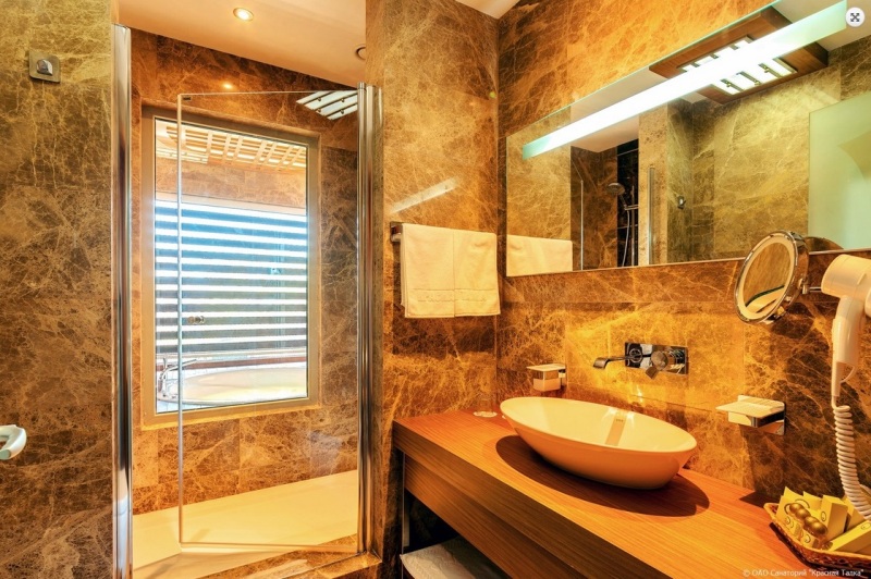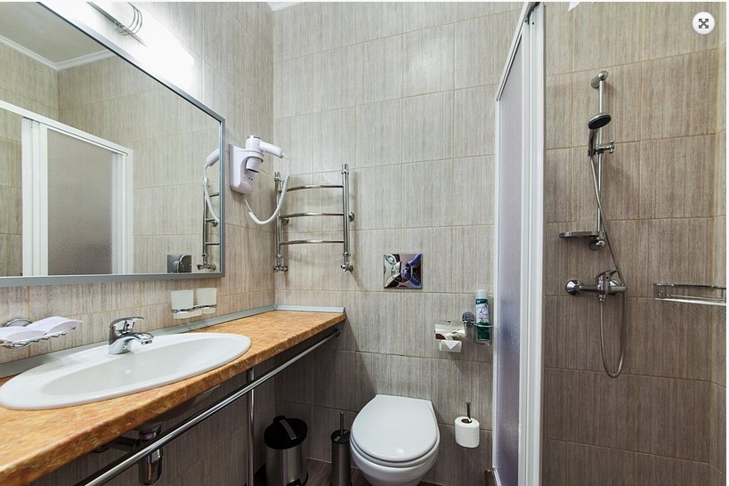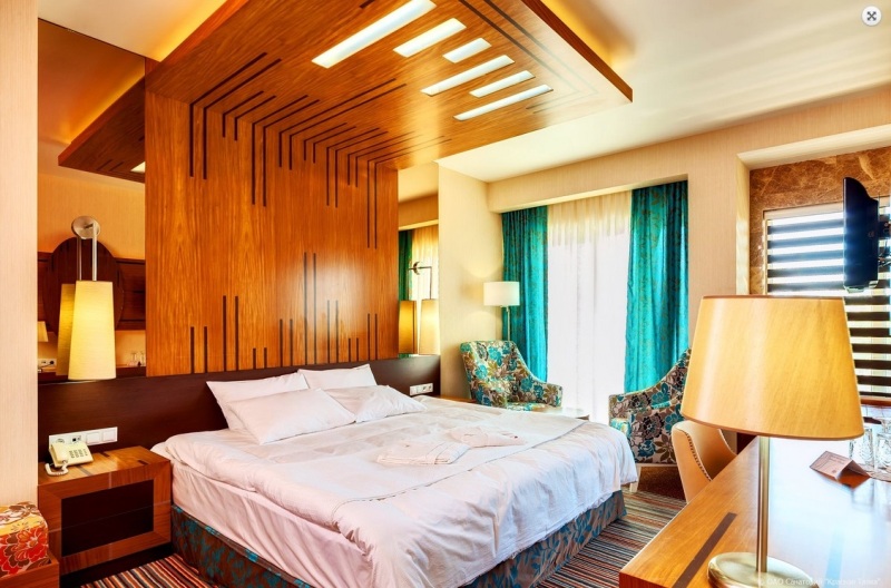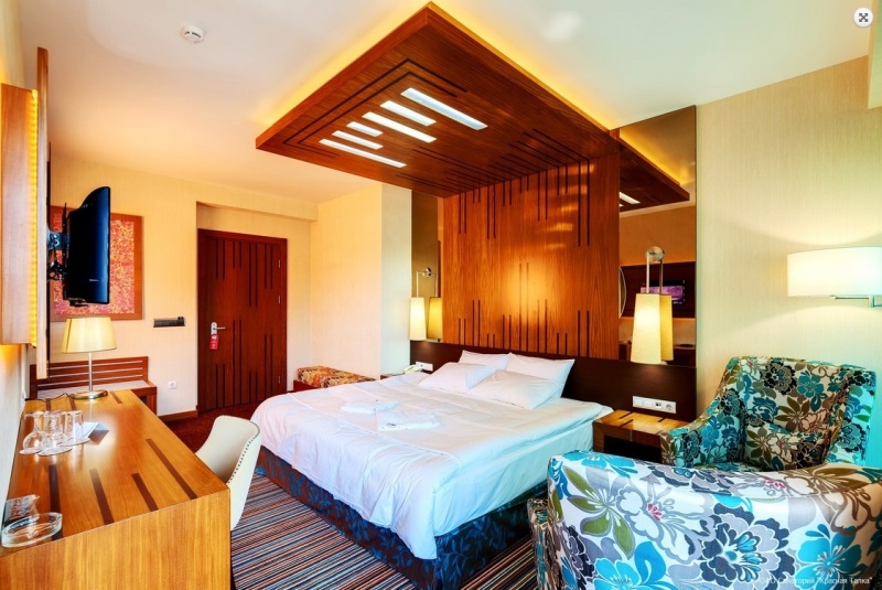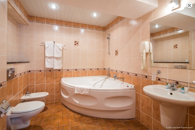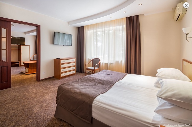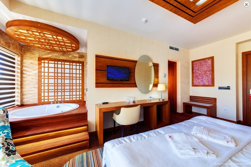Оснащение номера: спальня с большой кроватью, санузел (туалет, ванна, умывальник), фен, сплит-система, мини-бар (незаполняемый), телевизор, мини-сейф