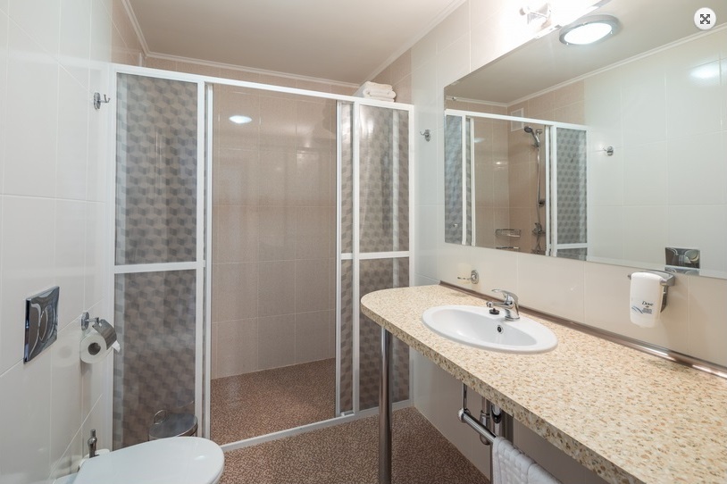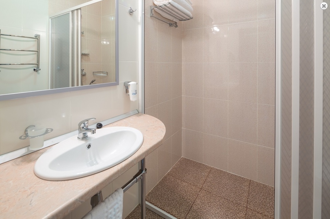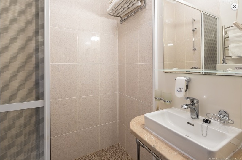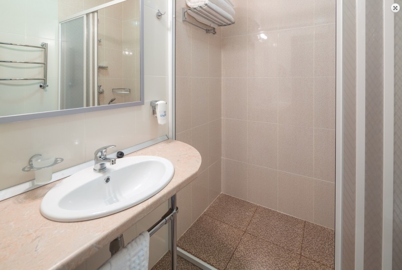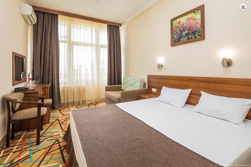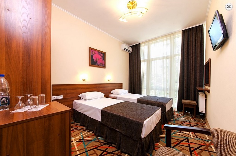 Оснащение номера: Все номера с большой кроватью и дополнительным местом, балконом, полным санузлом, феном, сплит-системой, мини-холодильником, телевизором. Площадь номера без учета санузла и балкона составляет 19 м2, санузел - 3,6 м2.