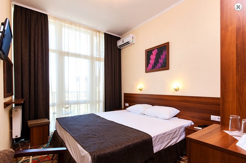 Оснащение номера: Все номера с большой кроватью и дополнительным местом, балконом, полным санузлом, феном, сплит-системой, мини-холодильником, телевизором
