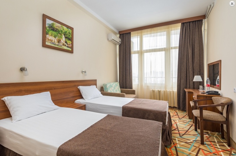 Оснащение номера: большая кровать или 2 раздельные кровати, полный санузел, сплит-система, мини-холодильник, телевизор, телефон, мини-сейф, фен.