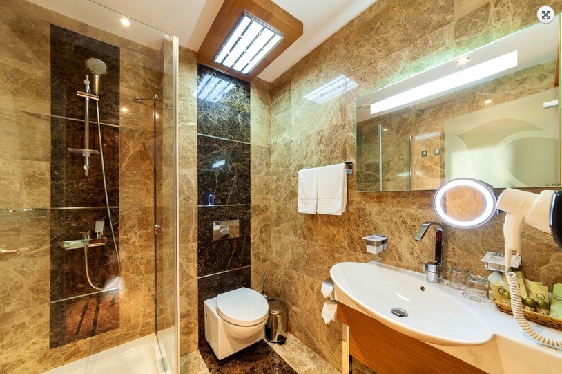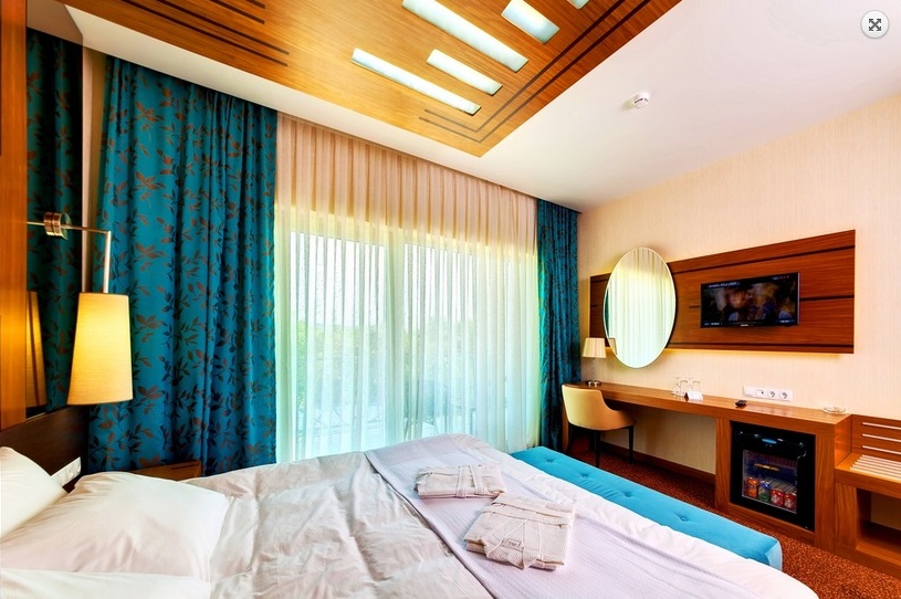 Оснащение номера: 32 номера - с большой французской кроватью и 32 номера - с двумя раздельными кроватями, полный санузел, фен, сплит-система, мини-холодильник, телевизор