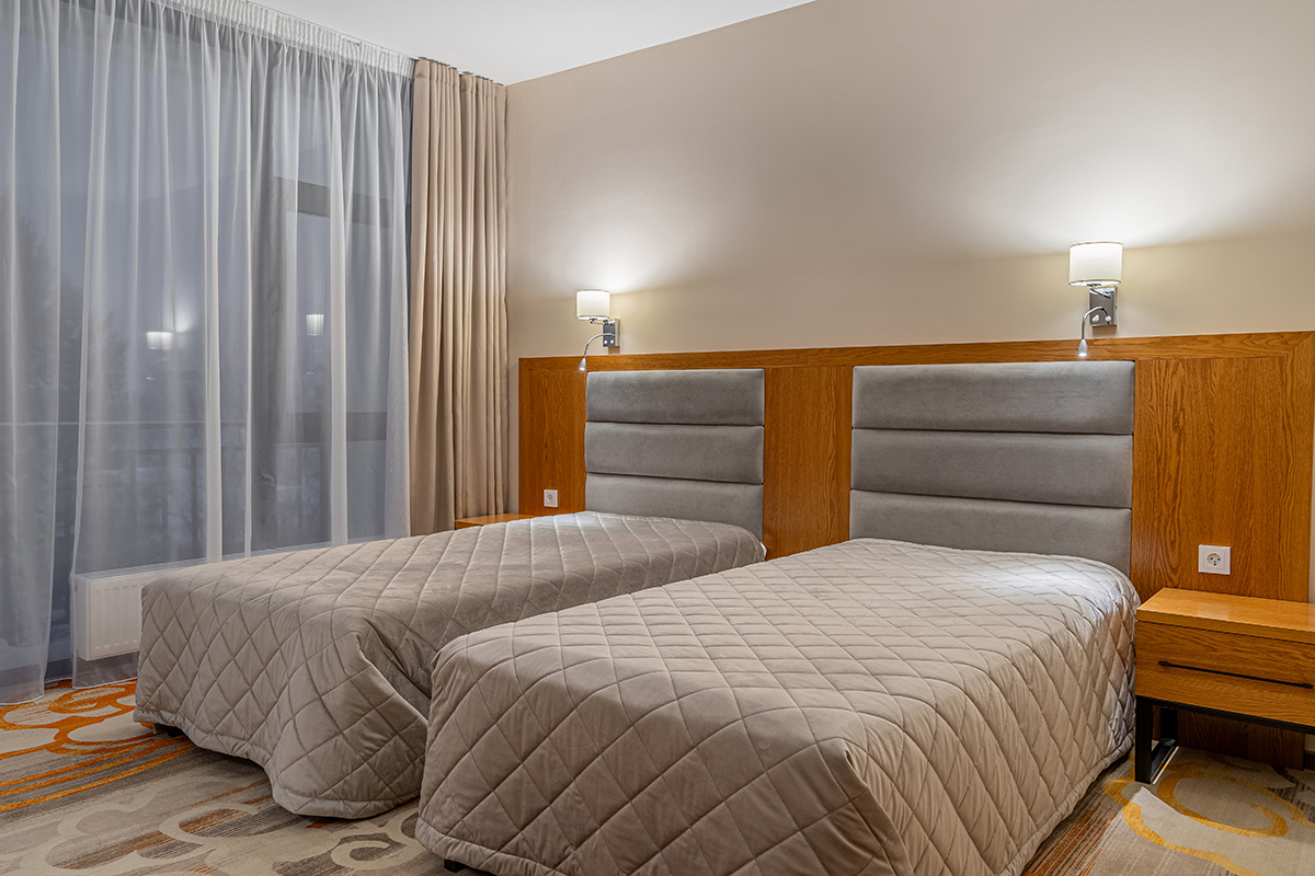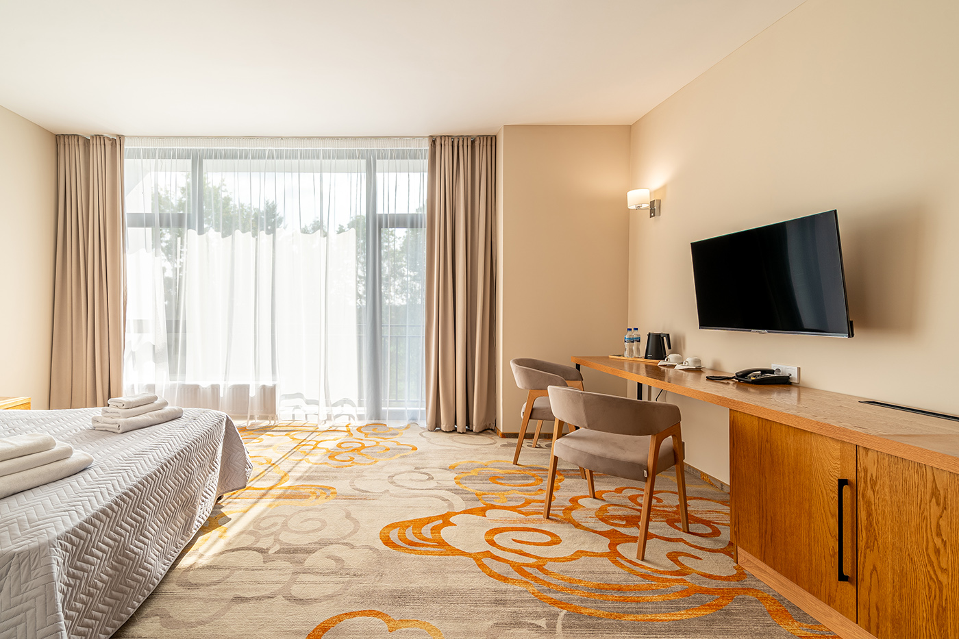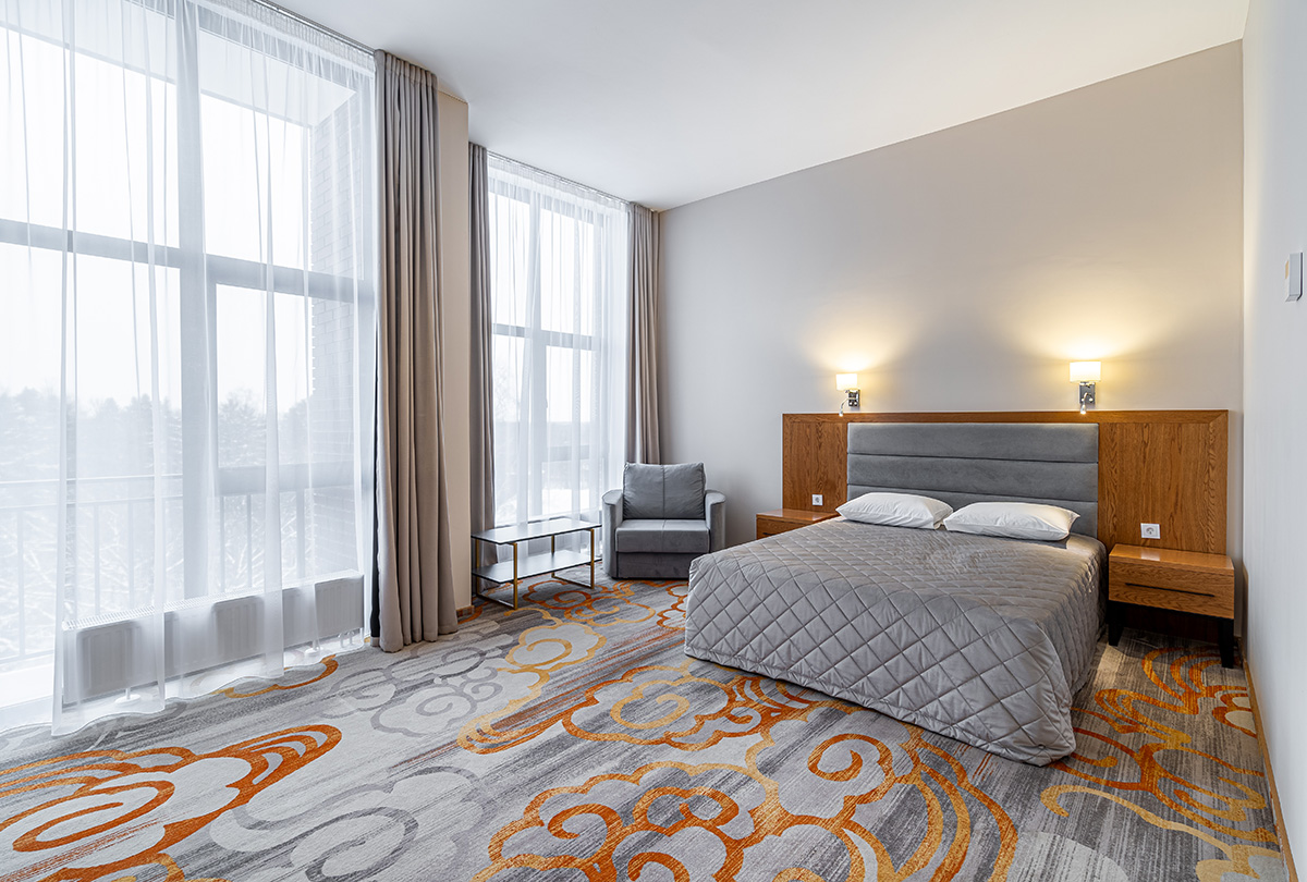 - 2-местный 1-комнатный Комфорт Премиум. Площадь номера 25-32 кв.м. В номере: две полутороспальные кровати или одна двуспальная кровать, плазменный телевизор, сейф, кондиционер, холодильник, чайная станция, душевая кабина, туалет, фен, балкон. Доп. место - раскладушка.