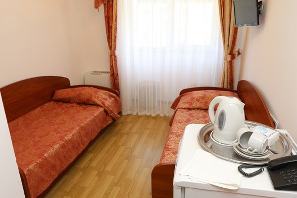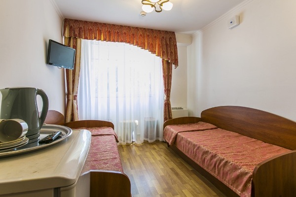 - 2-х местный номер 1-ой категории. В номере: две односпальные кровати, тумбочки прикроватные, журнальный столик , пуфики, зеркало, шкаф для одежды, холодильник, телевизор, телефон, фанкойл напольный, бра, люстра, санузлом с душевой кабиной, французский балкончик с видом на парковую зону и Генуэзскую крепость.