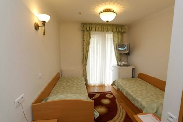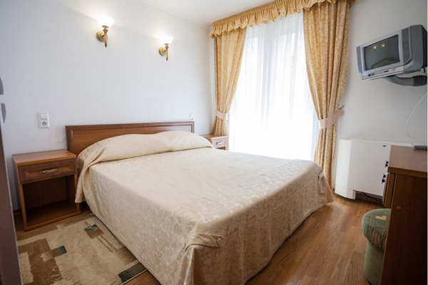 - 2-х местный номер 1-ой категории. В номере: две односпальные кровати, тумбочки прикроватные, пуфики, зеркало, шкаф для одежды, холодильник, телевизор, телефон, фанкойл напольный, бра, люстра, санузел с душевой кабиной, французский балкон, вид на горы, парковую зону и Генуэзскую крепость.