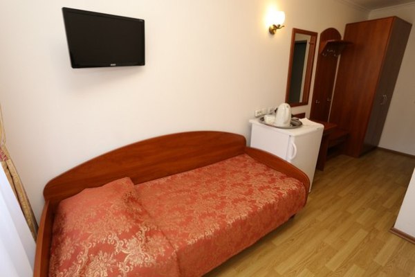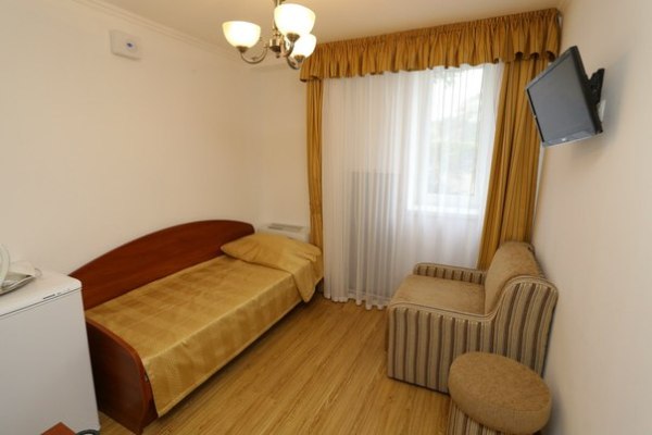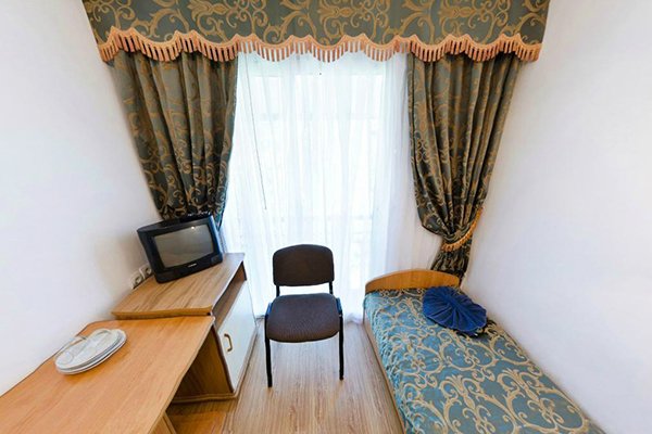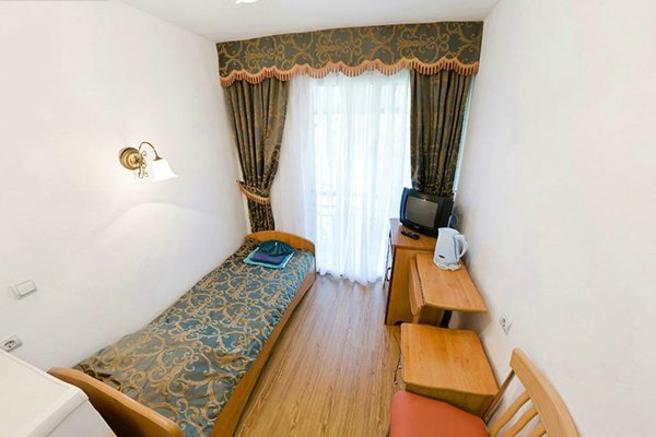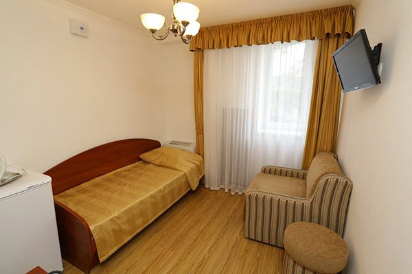 - 1-но местный номер 1-ой категории. В номере: односпальная кровать, тумбочка прикроватная, журнальный столик, пуфик, зеркало, шкаф для одежды, холодильник, телевизор, телефон, фанкойл напольный, бра, люстра, санузел с душевой кабиной, французский балкон с видом на парковую зону и Генуэзскую крепость.