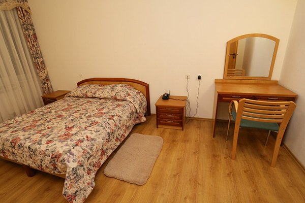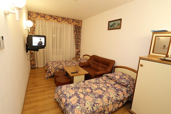 - 1-но местный номер 1-ой категории. В номере: двухспальная кровать, кресло, тумбочка прикроватная, столик, пуфик, зеркало, шкаф для одежды, холодильник, телевизор, телефон, фанкойл напольный, бра, люстра. Номер оборудован индивидуальным санузлом с душевой кабиной.