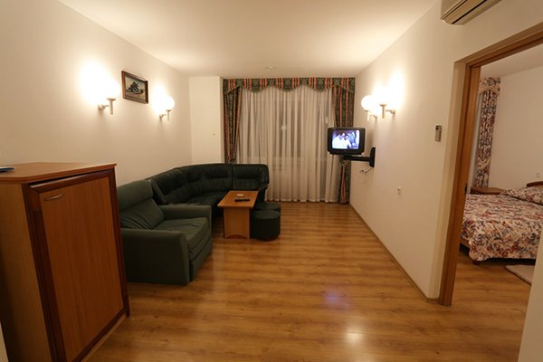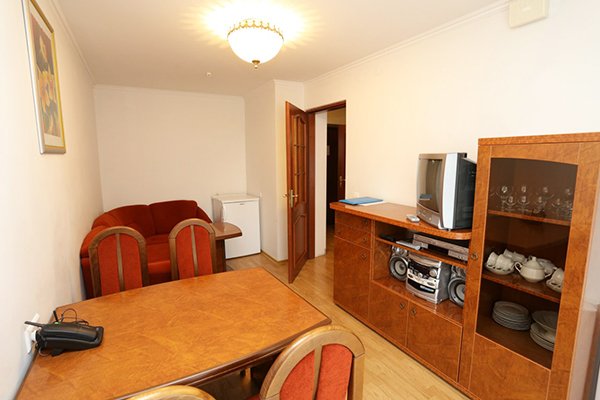 - 2-х местный 2-х комнатный повышенной комфортности, DBL. В номере: двуспальная кровать журнальный столик, зеркало, набор мягкой мебели, прикроватные тумбочки, туалетный столик, шкаф, кондиционер, телефон, холодильник, электрочайник, санузел с душевой кабиной, видом на двор. Дополнительное место диван.