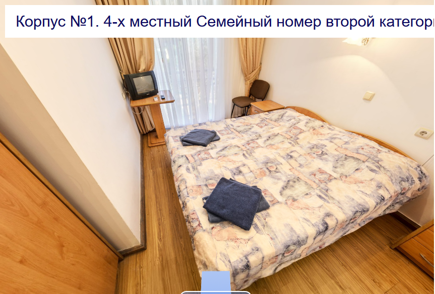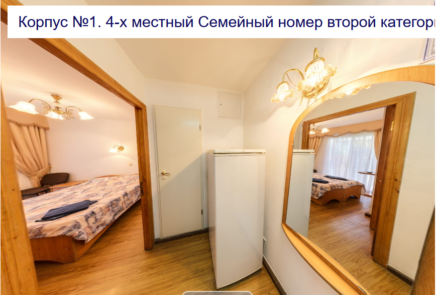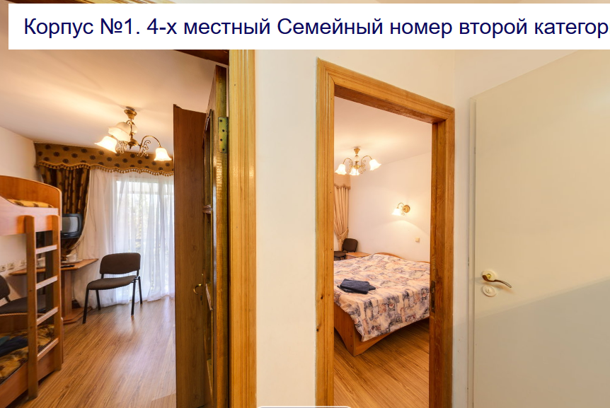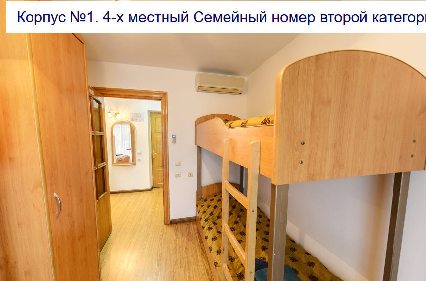 - 4-х местный номер 2 категории Семейный. В номере: 2 комнаты и прихожая, в прихожей шкаф для одежды, зеркало, холодильник, бра, люстра, в одной комнате находится двух спальная кровать, стол, два стула, тумбочка, телефон, кондиционер, бра, люстра, в другой комнате находится двух ярусная кровать, односпальная кровать, стол, два стула, тумбочка, телефон, кондиционер, бра, люстра, французский балкончик ,вид на море, парковую зону север, юг.