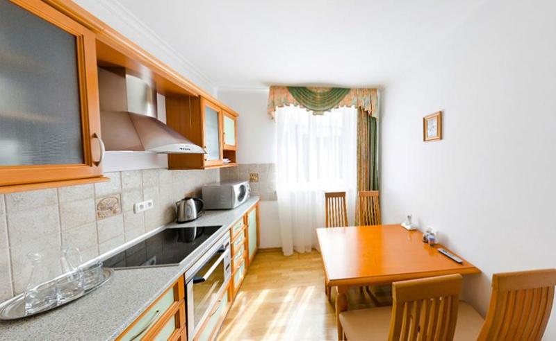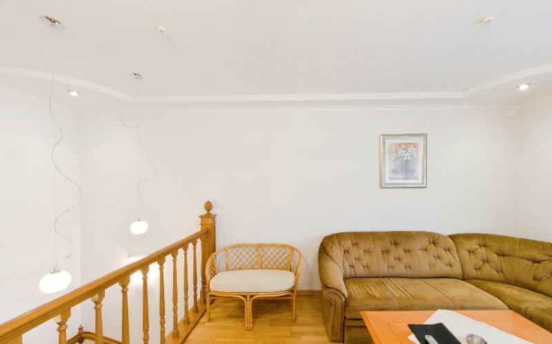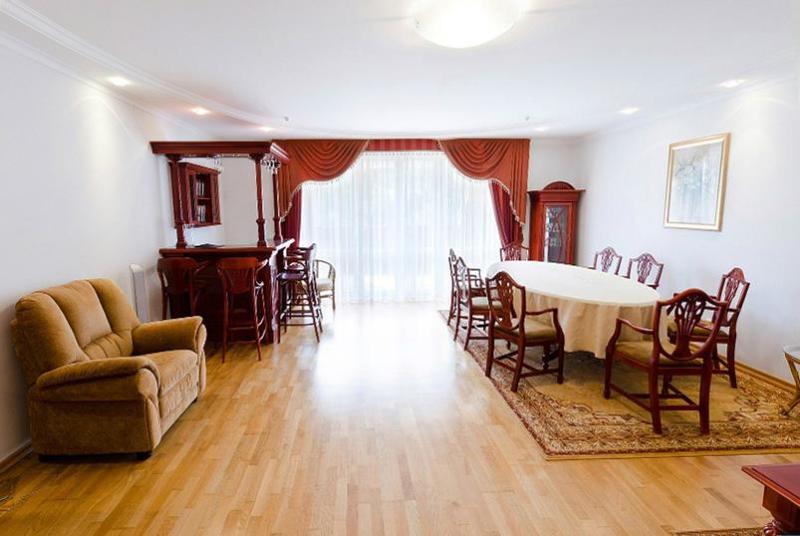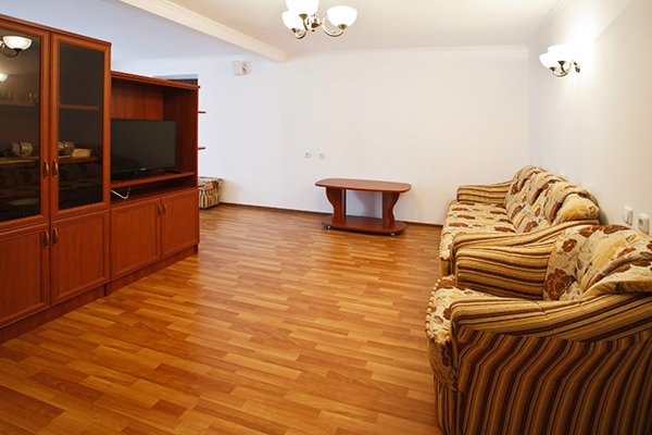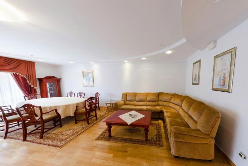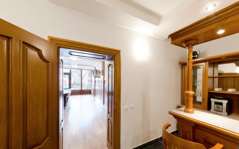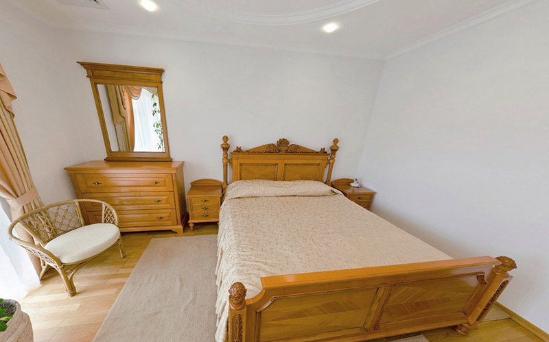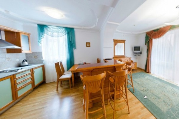 - 4-х местный номер "сюит" 3-х этажный. На первом этаже бассейн, сауна и комната отдыха с бильярдным столом. На втором - гостиная с выходом на террасу. В комнате есть мягкий уголок, кинотеатр, барная стойка, большой обеденный стол из натурального дерева, кухня с электрооборудованием и посудой, совмещенный санузел кабина - душ шарко, беде. Отдельный вход с прихожей. Третий этаж - две спальни с двухместными кроватями из натурального дерева, санузел и гардеробную.