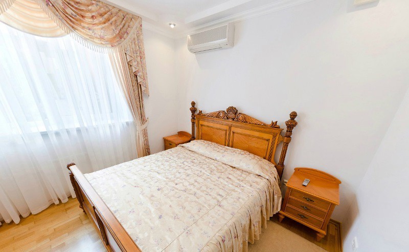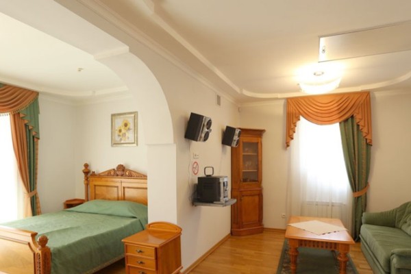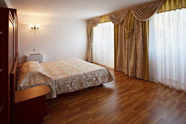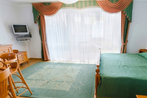 - 2-х местный номер 1-ой категории повышенной комфортности. В номере: прихожая, спальни и кабинета. В прихожей- зеркало, вешалка. Спальная комната разделена мебельным гарнитуром на зону отдыха и спальную зону. В зоне отдыха находится мягкий диван (раскладной), кресло, журнальный столик, телевизор, холодильник, телефон, фанкойл напольный, бра, люстра. В спальной зоне: двухспальная кровать, прикроватные тумбочки, туалетный столик с зеркалом, бра, люстра. В кабинете имеется рабочий стол, стул, шкаф купе. В комплектацию номера входит индивидуальный санузел с душевой кабиной. Вид на парковую зону и Генуэзскую крепость.