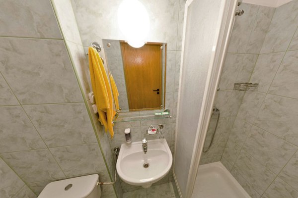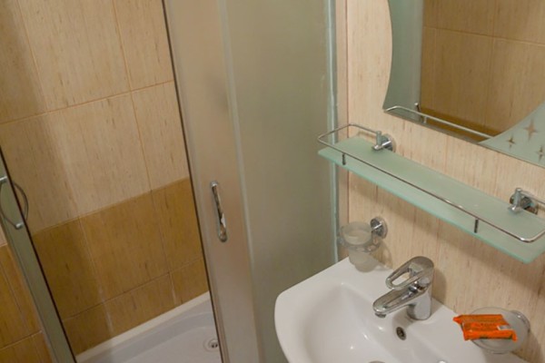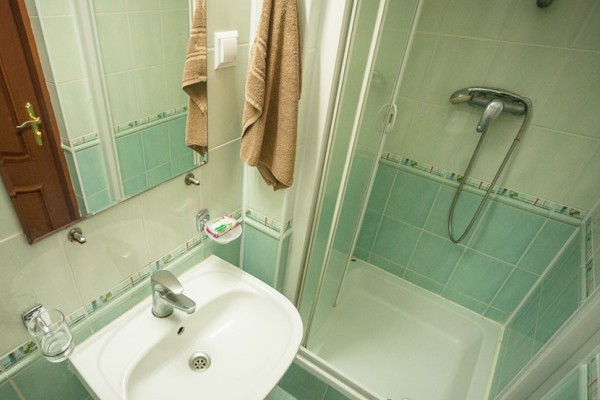 - 1-но местный номер 2-ой категории. В номер: односпальная кровать, кресло, тумбочка прикроватная, столик, пуфик, зеркало, шкаф для одежды, холодильник, телевизор, телефон, фанкойл напольный, бра, люстра, санузел с душевой кабиной.